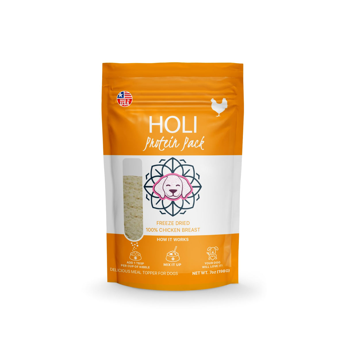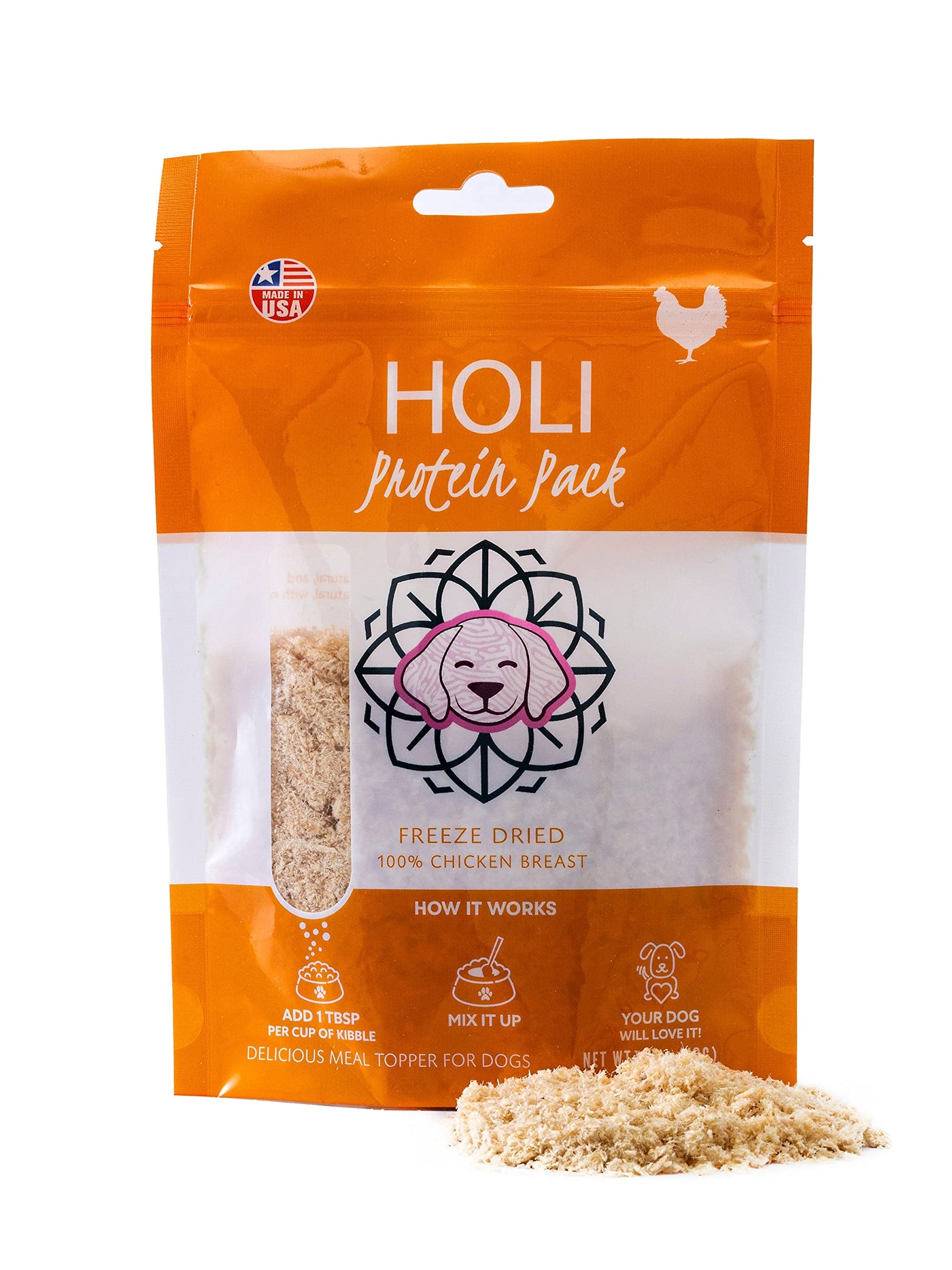 HOLI meal mixers for dogs are an appetite stimulant that will bring excitement to mealtime. Just mix in 1-2 tbsp chicken breast powder per cup of kibble and watch your pup lick the bowl clean! We dont like to eat the same thing every day, and neither do our dogs. Adding freeze dried food topper or dehydrated dog food to our pups meals is more than just a dog food flavor enhancer. Its the best way to add ultra high quality protein to their diets. Your pup will get the benefits of raw dog food without the mess and in a safe and healthy way.