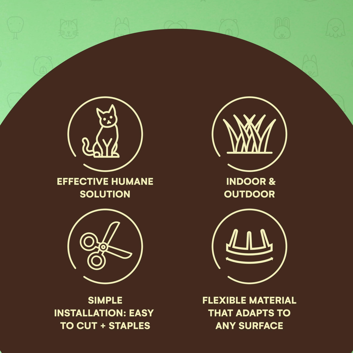 HOMARDEN PRICKLE STRIP We love our furry family members but sometimes they need to learn not to scratch or dig through our furniture and lawns. This 13ft roll of Homarden mats are the ideal solution to training them to keep off of our couch and garden beds. These mats are also great for outdoor use to keep wildlife away from gardens, trees, cars, and patios. Each mat measures at 13 ft x 11 inches and can be placed together for more comprehensive coverage. COUCH PROTECTOR Pet hair and claw marks are the main culprit of shabby furniture. Place a mat on top of your dining table, couch cushions, or your favorite chair to discourage your fur baby from jumping up and marking their territory. FEEL FREE TO USE IT OUTDOORS Have a garden full of flowers and vegetables that your puppy loves dig up and chew? Homarden mats blend in with their surroundings to catch animals off guard and scare them away. Place them in front of your garden beds to keep critters out. They can be wrapped around trees, fences, and bird feeders as well to keep away any curious squirrels, pigeons, or strays. LARGE SCRAM MATS The large size helps discourage determined animals from simply jumping over or walking around to reach your property. HUMANE HOUSEBREAKING We love all animals but house training a new puppy or kitten can be difficult. Homarden mats are a humane, pain free solution to keeping large and small animals away from furniture, gardens, patios, and any other areas you want to be animal free.