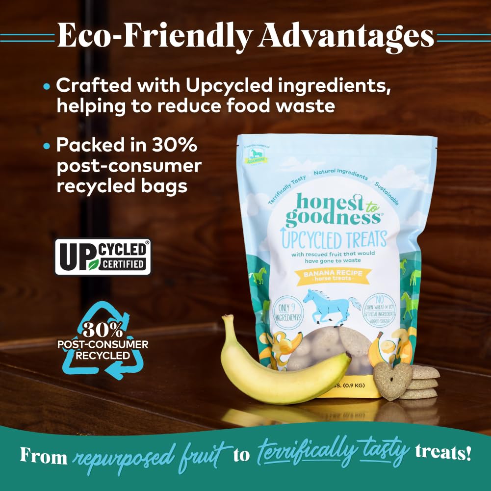 Honest to Goodness Upcycled Horse Treats - Banana Recipe are made with just 9 simple, natural ingredients to give your horse the wholesome treat they deserve-without any corn, soy, wheat, or added sugar. Made with alfalfa, oats, flaxseed, and upcycled bananas, these crunchy, heart-shaped treats are packed with goodness your horse will love. These treats are rich in Omega-3 fatty acids and beta glucans, helping to support digestive health, immune health, and overall well-being. Theyre the first and only Upcycled Certified horse treat, made using rescued bananas that would otherwise go to waste-helping reduce food waste in a meaningful way. Packaged in bags made from 30% post-consumer recycled plastic, theyre better for the planet, too. Feel good about supporting the environment while doing something great for your horse. Proudly made in the USA.