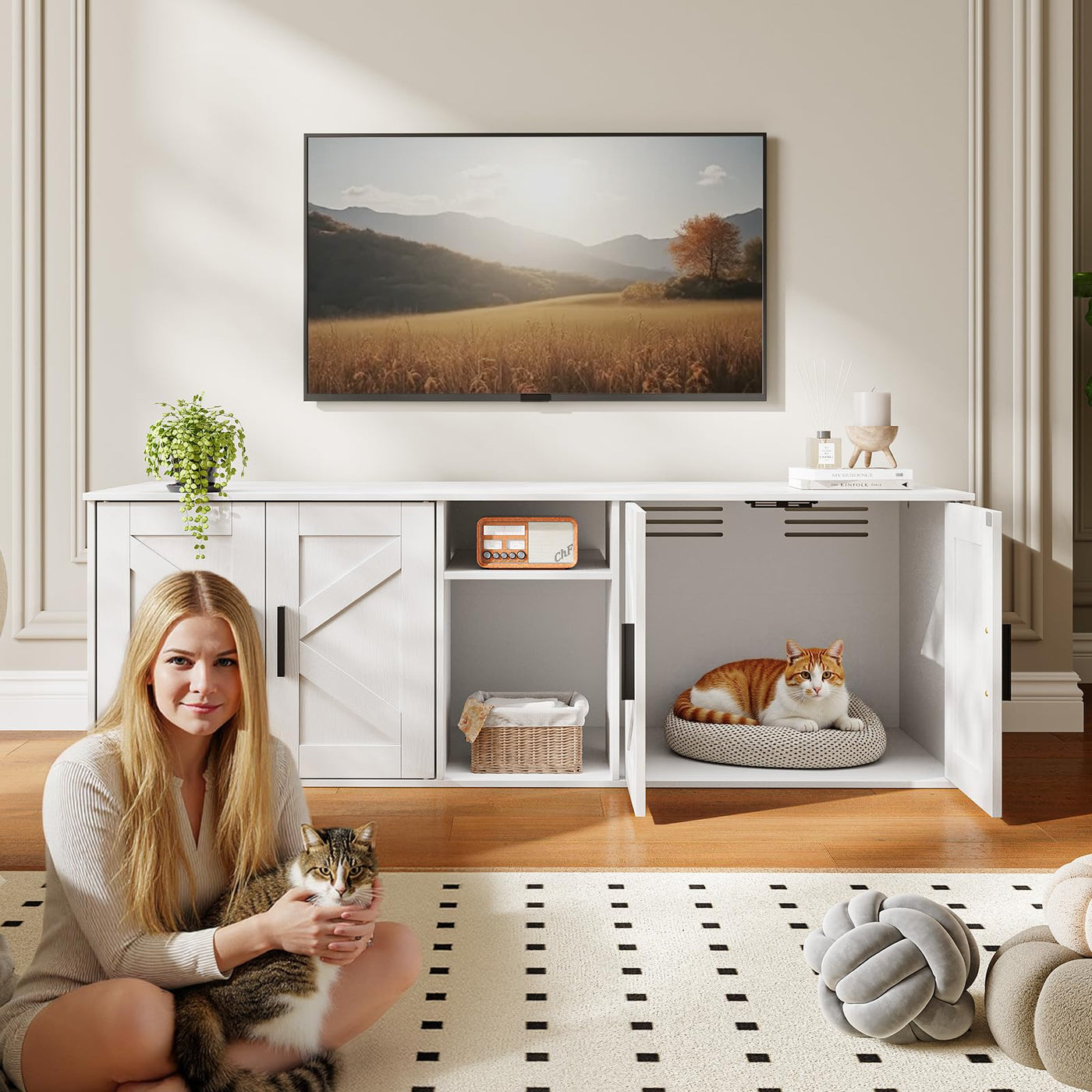 Hoobro 58.3'' Cat Litter Box Enclosure, Litter Box Furniture For 2 Cats, Cat House With Corridor, Tv Stand With Storage, Double