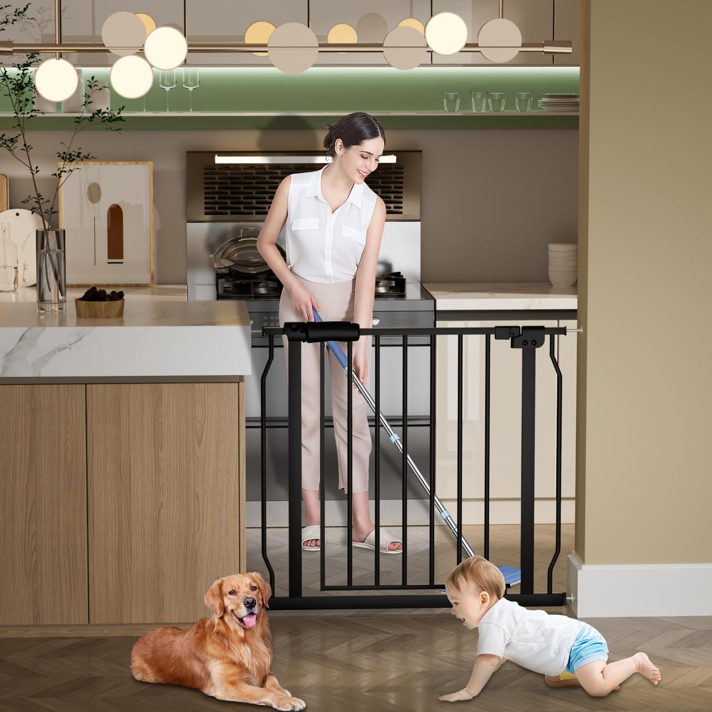 'HOOOEN Indoor Extra Wide Baby Gate for Kids and Pets With Pressure Mounted Design: Our walk through baby gates use dual-lock system to limit kids or pets access and keep them safe. Adults can easily lift the handle up by one hand but difficult for children. This baby gate will auto-close when handle is released. Double sided design allows you open in either directions. Stands 30 inches tall. The 2 inches distance between vertical bars can prevent your babies and pets from squeezing out or getting their heads caught in. Variety of Width Options Can Choose: Our safety walk thru baby gate has variety width to choose:Different sizes with different extension panels,all sizes can be easily adjusted,fits small or wide spaces from 24 to 81 inches.Please measure your openings carefully before purchasing. HOOOEN Safety Child Gate Features: Durable & Sturdy Material Convenient One-hand Operation Auto-closed Design to Save Your Time Sturdy Enough to Keep Your Baby Safe Double-Locking Design for Extra Security Dual-swinging Doors Convenience to Use Adjustable Gate Fit Openings from 24.2'' to 76.38'' Pressure Mounted Convenience to Move and Install Different colors can choose which can fit different decoration styles Easy Install: This pressure mounted baby gate is super easy and quick to install and remove. The only thing you need to do is adjusting the 4 spindle rods independently to the wall. If you choose the size with extension panels, it is very simple to be added in. Just use the screws that secure the gate on the outside end of the extension and push them into the gate till tightened up. MULTI-FUNCTIONS: Suited for stairs, hallways, doorways, kitchen, living rooms and any indoor and outdoor spaces. ''