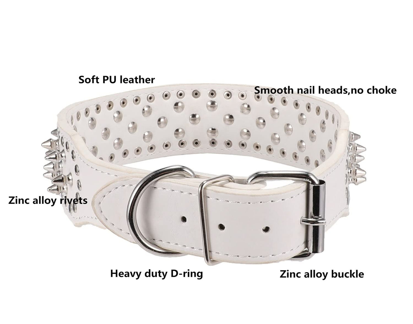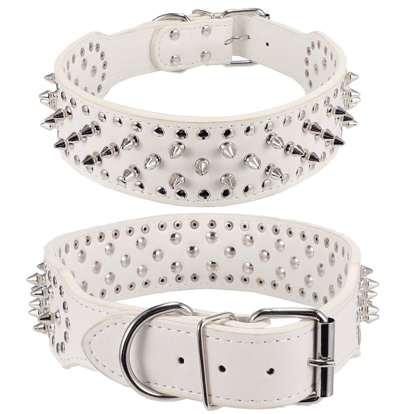 Hoot Pu Leather Adjustable Spiked Studded Dog Collar 2'' Wide 43 Spikes (L(Neck 21''-24''), White)