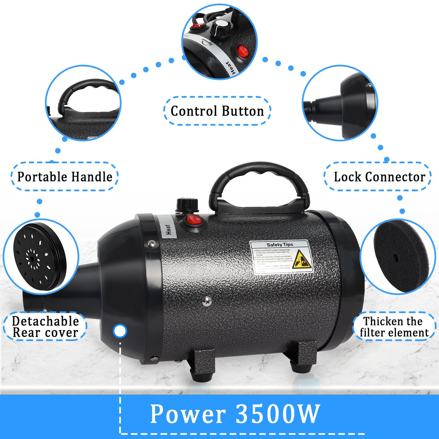 Dog Dryer For Large Dogs, 5.2Hp 3500W High Velocity Pet Hair Dryers With Heater For Grooming, Spind Temperature Adjustable Pet Dryer Machine With 4 Nozzles And 1 Dog Ear Protection