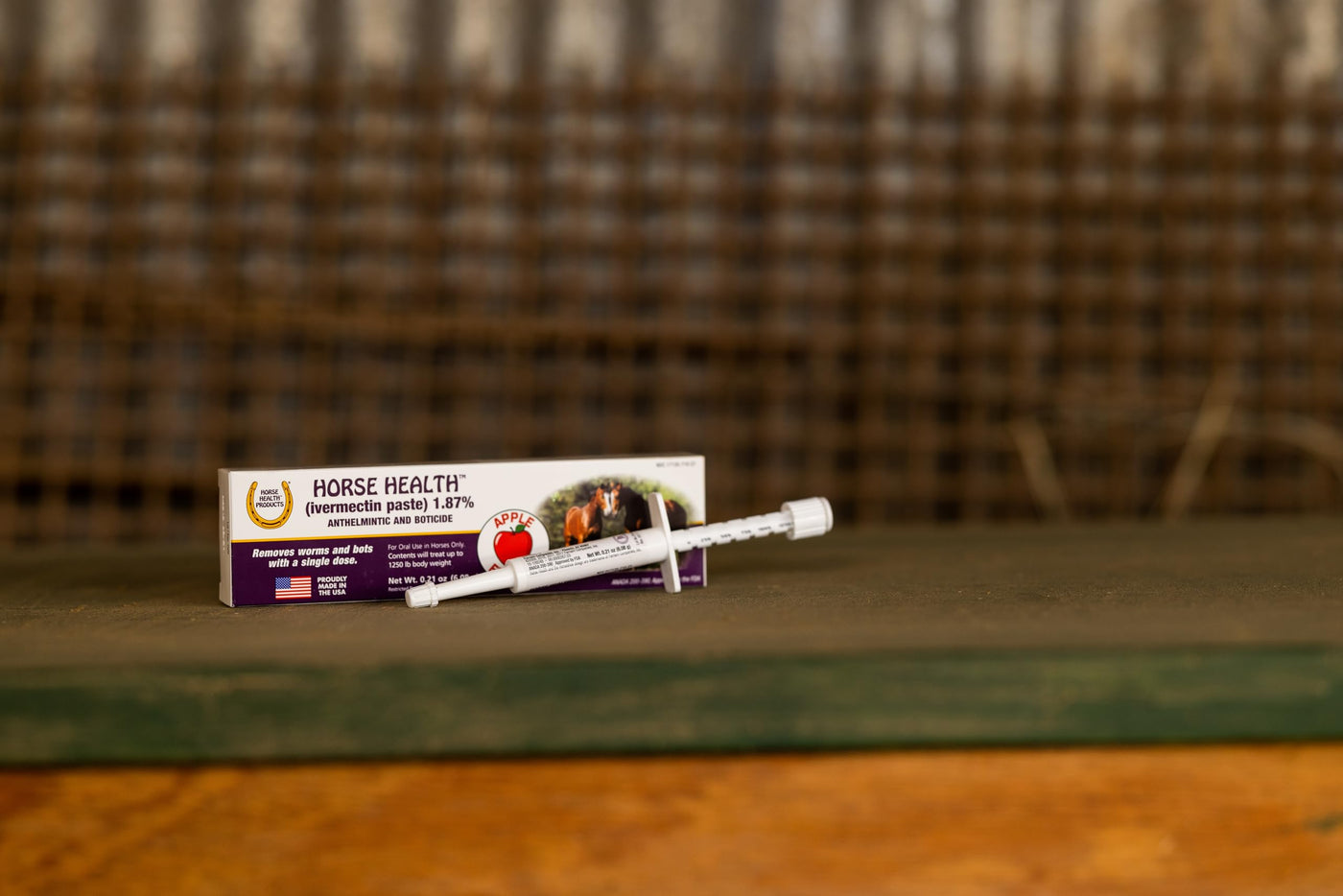 All horses get internal parasites, especially when they are kept where other horses have been. If you board, breed, travel or just hang out with other horsemen and their horses, you need to deworm your horse regularly. Damage caused by parasites can lead to serious gut problems including impactions, diarrhea and colic. Ivermectin is the most popular compound for equine deworming today. It has a broad range of activity against equine parasites. Horse Health (ivermectin paste) 1.87% provides effective treatment and control of the following parasites in horses: large and small strongyles, pinworms, ascarids, hairworms, large-mouth stomach worms, bots, lungworms, intestinal threadworms and summer sores caused by Habronema and Draschia spp. cutaneous third-stage larvae. It removes worms and bots with a single dose. One syringe deworms horses up to 1,250 lbs (600 kg) body weight. The apple-flavored past is safe and effective on all horses including broodmares, stallions and foals. Horse Health (ivermectin paste) 1.87% is proudly made in the USA.