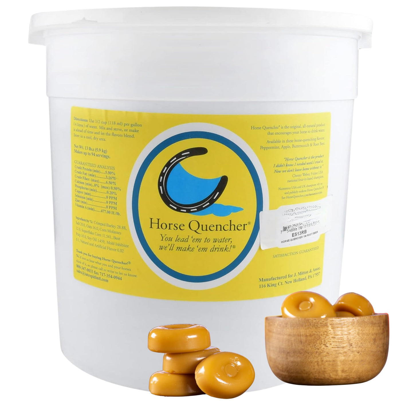 Equine Fresh Hydration: Our butterscotch 13lbs Pail is an ideal horse quencher, ensuring optimal horse hydration. Formulated with all-natural grains, its a perfect thirst quencher for your equine companion. | Butterscotch Horse Treats: Infused with a delightful peppermint flavor, our horse treats butterscotch blend provides a refreshing experience. Its the best way to incorporate horse vitamins and hydration into your pets diet. | Comes in Four Flavors: Horse Quencher not only comes in butterscotch. This product also comes in apple, peppermint, and root beer. Any flavor will ensure your horse stays hydrated | Horse Hydration: Our horse quencher butterscotch blend is enriched with natural grains. This unique combination not only serves as a horse quench but also a delightful treat for your horse. | Health Prevention: Regular intake of our horse quencher hydration product can prevent health issues. You lead em to water, well make em drink! Ensure your horses health is top priority with this butterscotch flavored Horse Quencher