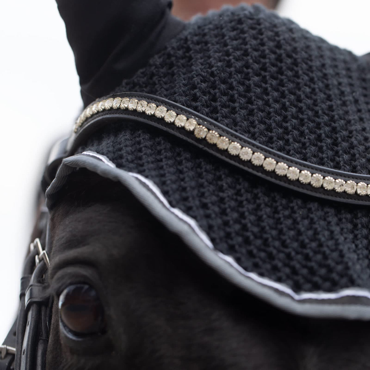 Beautiful ear net in gorgeous colors for the new season! Our Adepto ear net is made from detailed crochet with soft cotton ears. A striped trim matches the ears and adds a pretty detail. Pair with Adepto saddle pad (#17343 or #17353) for a full look.