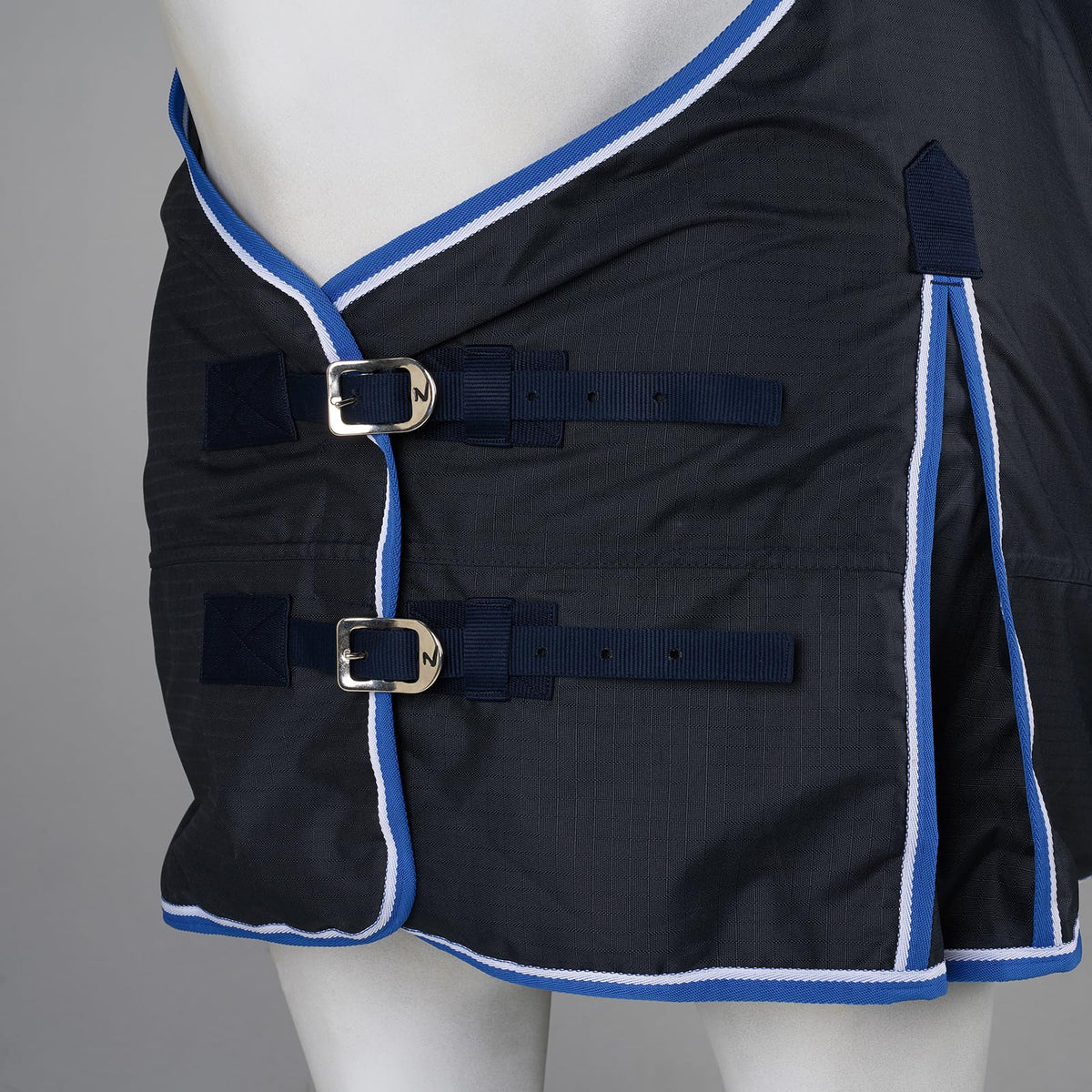 This light turnout blanket protects your horse and keeps it dry. This blanket is made from a waterproof, breathable fabric. The good fit at the neck and shoulder area makes it comfortable, and the high gussets allows lots of movement. The front buckles, X-surcingles, leg straps and tail flap secure the turnout.
