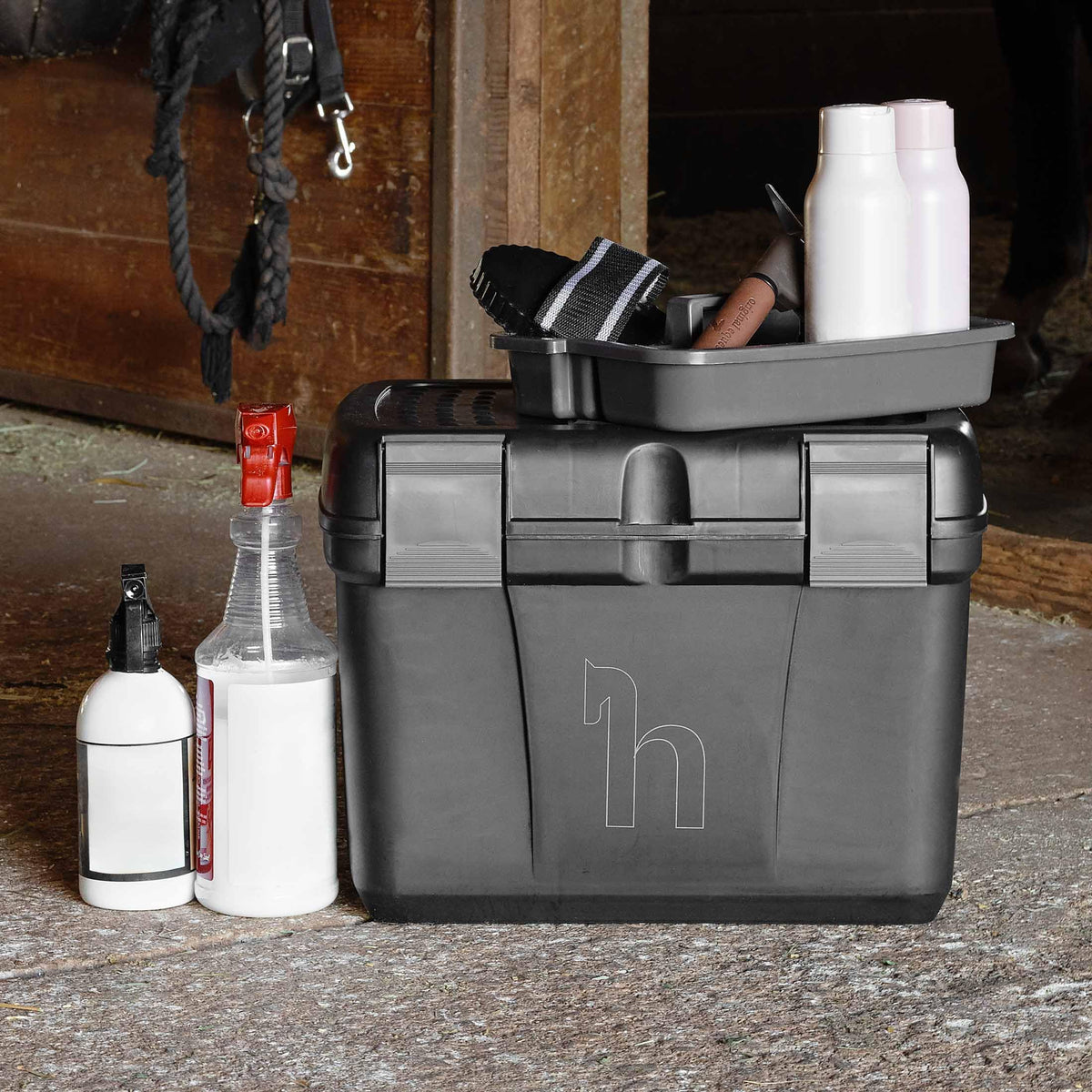 A Durable Grooming Storage Box With Plenty Of Room For All Your Tools. The Horze Smart Grooming Box Features A Non-Slip Surface That Allows You Stand On It With Confidence. The Inside Has A Removable Tray To Organize Your Grooming Tools. A Split Compartment Under The Tray Allows You To Store Larger Items. Two Snaps Lock The Case For Easy Mobility. Doubles As A Step For Grooming Your Horse. Made Of Polypropylene, A Durable Plastic Resistant To Cracks. Non-Slip Surface. Size: 16 X 12 X 11.6 Inches (40.8 X 30 X 29.5 Cm). Holds Up To 17.5 Lbs. (8 Kg).