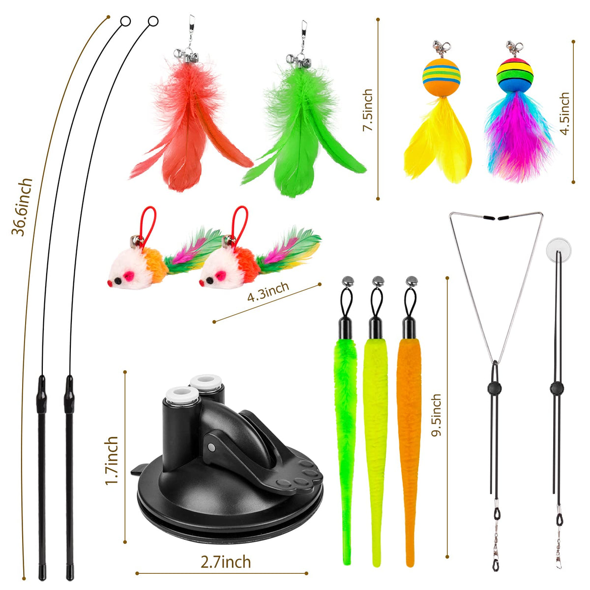 Q: What is included in the package and how many toys does it come with?A: The package includes 2 cat wands, 2 suction cups, 4 feather toys, 2 mice toys, 2 fur balls, 2 worm toys, and other accessories, totaling 12 interchangeable components to keep your cat engaged.