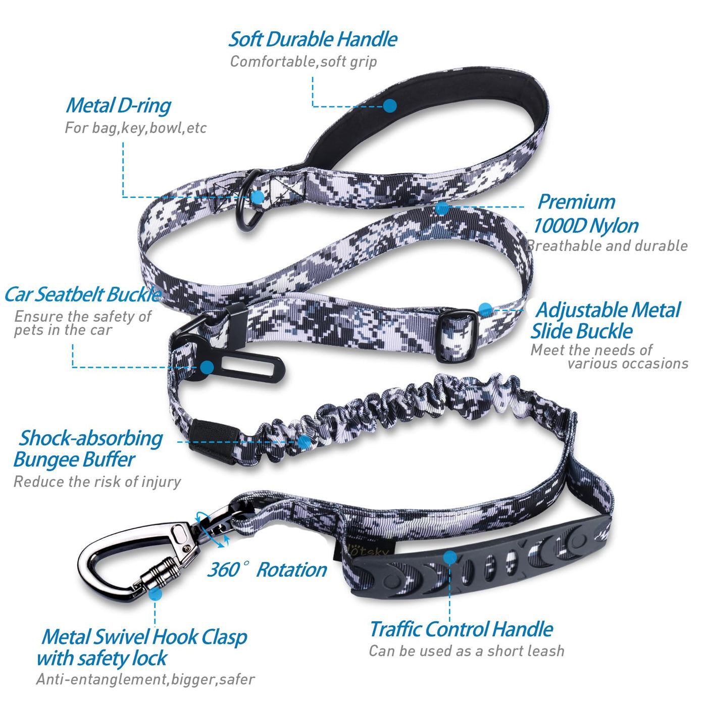 Hotsky Tactical Dog Leash Heavy Duty,4-6Ft Strong Bungee Shock Absorbing Lead With Padded Double Handle,Car Seatbelt,Metal Carab