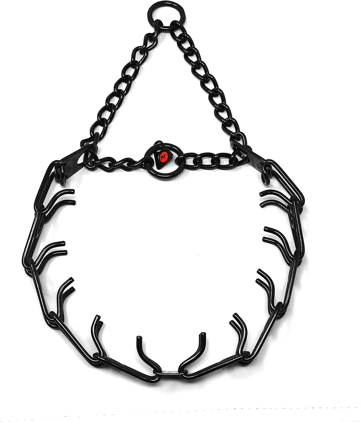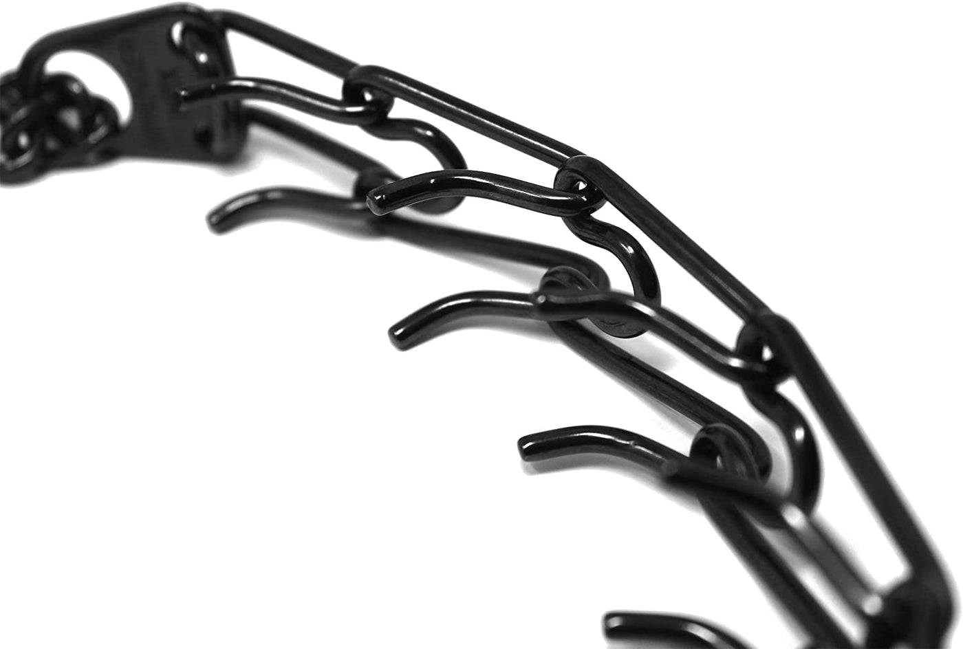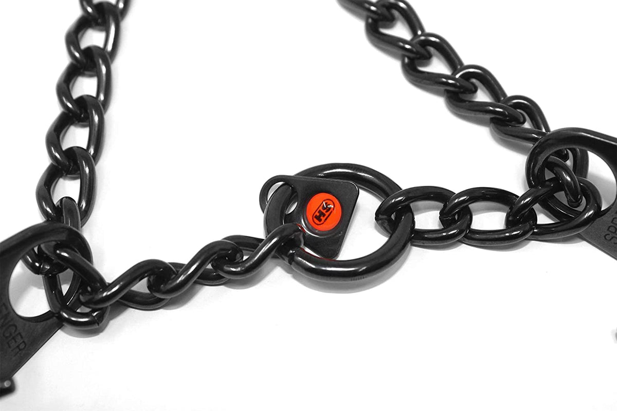 The Herm Sprenger Black Stainless Steel Prong collar is one of the most recognizable and popular names in obedience training tools. A safe and effective alternative to choker collars, it puts even pressure around the neck, about every half inch, pinching the skin in a band. This collar does not apply direct pressure to the trachea, so you can train your dog with little or no tugging, jerking, or pulling. The addition of a center plate connector allows the middle link to be configured symmetrically, enabling the prongs to tighten in the same direction. Made of high quality German Black stainless steel, the size of this collar can be adjusted by adding or removing the links individually. Features: interlocking links, each link equipped with two blunt prongs slips over dog's head for easy on, easy off slightly beveled prong tips easy to increase or decrease in size Made of high quality Black stainless steel Additional links sold separately. Sizing instructions: collar should fit snuggly just below the dog's ears, measure the circumference of dog's neck and add 3 inches. These Black Stainless steel collars with O ring come in three sizes 2.25 mm gauge x 16 inches overall length, 3.2 mm gauge x 23 inches overall length and 4 mm gauge by 25 inches overall length.