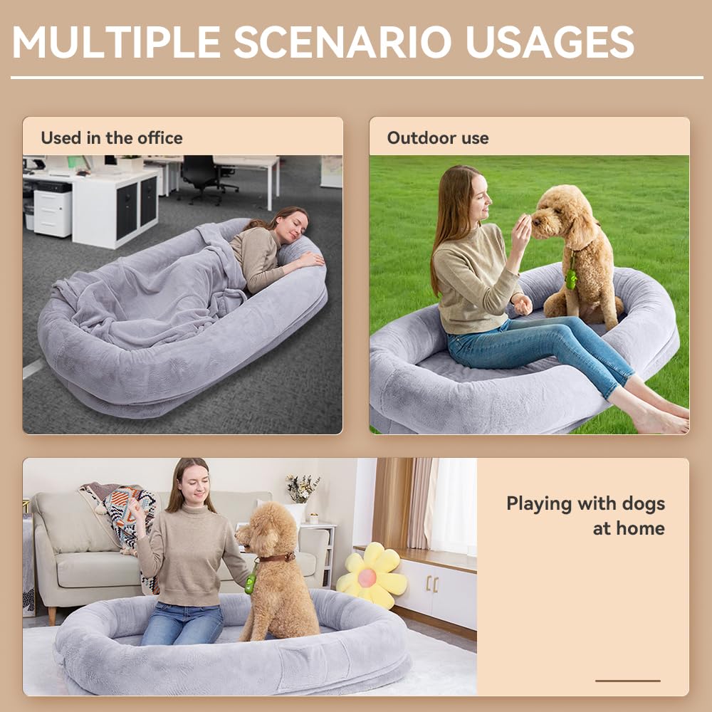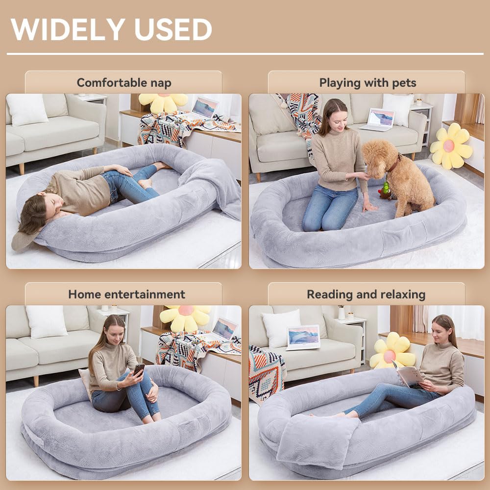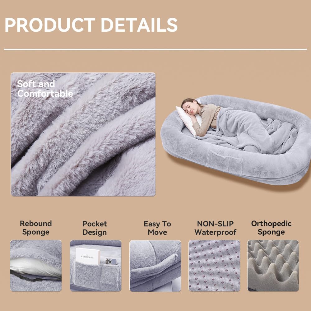 Description: Do You Love To Take Naps Or Get On The Floor And Play With Your Dog? If You Do, Then Our Ultra-Soft Human Size Dog Bed Is What You Need! This Oversized Dog Bed Features Everything You Want To Make Your Pet Bonding Experience Comfortable, Like A Luxuriously Soft Fabric Cover, Orthopedic Foam, Waterproof Lining, Anti-Slip Bottom And Convenient Handles On Both Ends For Easy Carrying. The Fabric Cover Has Durable Zippers To Make It Easy To Slip On/Off For Cleaning In A Washing Machine. The Super-Soft Bolster Surrounds The Entire Bed And Provides A More Secure Feeling When You And Your Pet Are Sleeping Or Taking A Relaxing Break. The Convenient Side Pockets Are Handy For Holding Magazines And Cell Phones. As An Added Bonus, We Throw In A Soft, Snuggly Blanket To Complete Your Naptime And Make You Feel Like You'Re Wrapped Up In A Warm Hug Anytime You Lay In Our Ultra-Soft Human Size Dog Bed For People And Pets. Order Yours Today