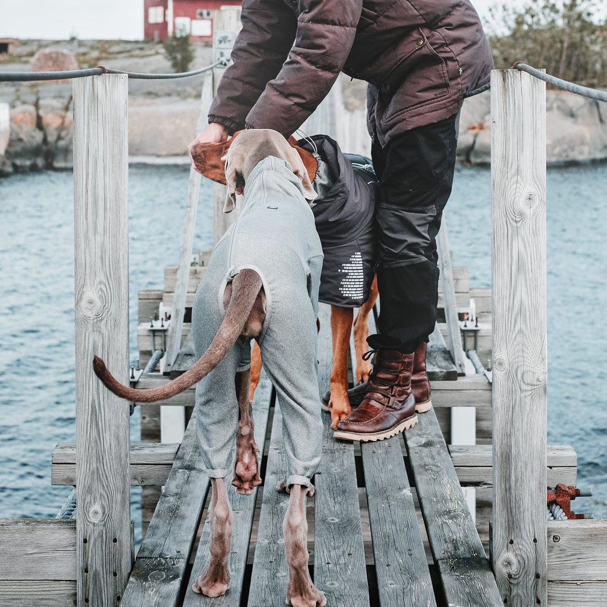 The Body Warmer overall is a multi-purpose product suitable for an active dog's muscle care, and for providing extra warmth under a waterproof jacket or overall. It is also ideal for ageing dogs, and dogs undergoing rehabilitation. The foil material on the inner surface reflects the dog's body heat and provides extra warmth. Smooth and elastic material makes the overall very comfortable to wear. The overall has an adjustable belt and collar. Reflectors on the seams make the dog more visible in the dark.