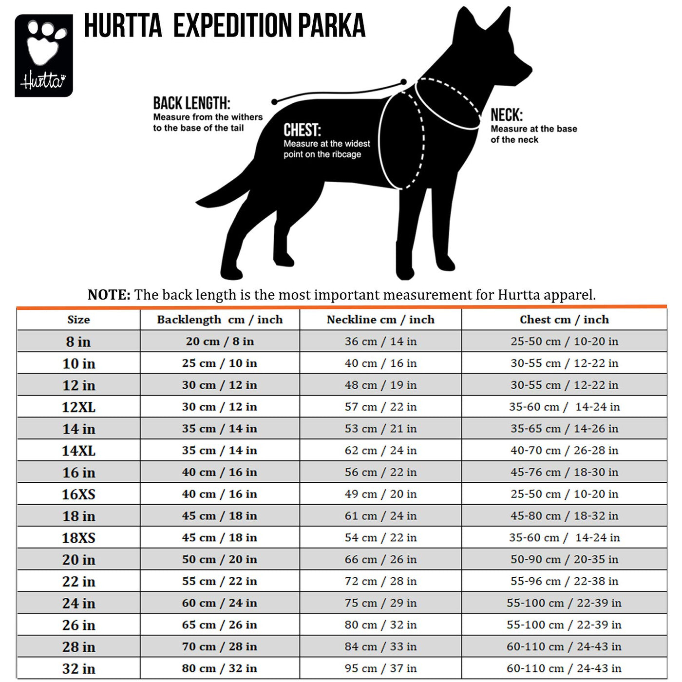 HURTTA EXPEDITION PARKAThe Expedition Parka is an excellent choice for small and big adventures in cold weather. The Expedition Parka has been especially developed for short-haired dogs and dogs without undercoat, but in cold conditions it is suitable for all other dogs as well. It is suitable for extra warmth, for example, for agility dogs after workouts or for dogs needing warmth due to their age or health.The technical surface material of the easy-to-use coat is excellent for even the toughest of conditions. The Expedition Parka is designed to allow for extended range of motion when the dog is running and playing. The water- and windproof soft elastic segments on the front are flexible with the dog’s movements. The neckline, length of the back and the collar circumference of the Expedition Parka can be adjusted.Both the lining and surface fabric are certified to be safe and free of harmful substances in accordance with the Öko- Tex-standard 100. Made with fluorocarbon-free Rudolf ECO water-repellent treatment. In addition to the basic sizes 8–32”, there are sizes 16XS and 18XS for Dachshunds and 12XL and 14XL for small, bull-type dogs.