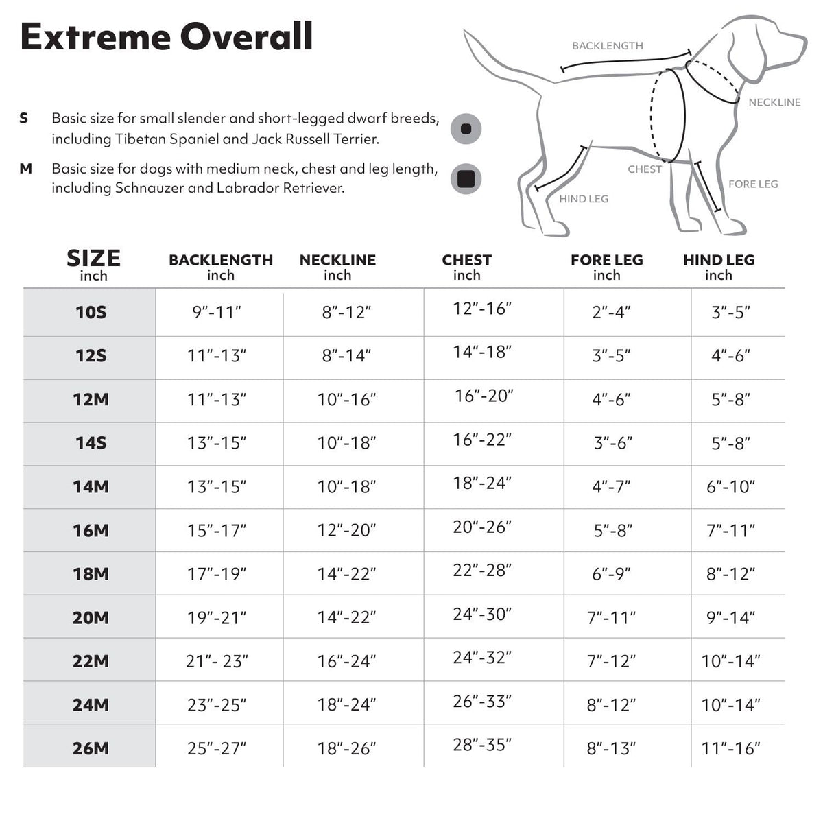 3M reflectors on the front legs of the Extreme Overall and large reflective prints improve the dog’s safety in the dark. The overall have an opening for a leash. In the size 25S, the harness is integrated.