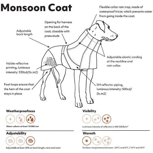 Hurtta Monsoon Raincoatthe Monsoon Raincoat Is An Essential Piece Of Gear For Every Dog In Rainy, Windy Or Muddy Weather.The Monsoon Coats Collar Seams Are Vertical, Allowing The Collar To Be Taped So That It Is Fully Waterproof. In Addition, There Is A Rain Collar Made Of Waterproof Tricot Around The Edge Of The Collar, Preventing Water From Going Inside The Coat Along The Dogs Neck. The Comfortably Soft Collar Can Be Tightened Up Around The Dogs Neck To Protect The Chest And Neck Area.The Large, Attractive Reflective Prints On The Coats Rear Hem And The 3M Reflector Piping On The Back Improve Safety And Visibility In The Dark. The Excellent Sizing Of The Monsoon Coat Guarantees A Good Fit For Most Breeds. The Wide Belly Flap Keeps The Coat In Place, Ensuring That It Stays On Without Restricting The Dogs Movement, Even During Boisterous Play. The Flap Covers The Dogs Belly And Efficiently Protects It From Mud And Sand. Monsoon Is Made Of An Elastic And Silent Fabric, So It Is Comfortable To Use And Quick To Put On.