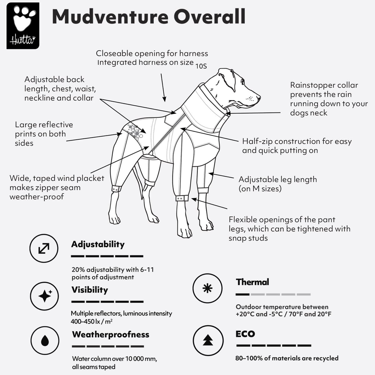 The Mudventure Overall ECO not only says you can, its lightweight-yet-durable, weatherproof fabric and fully taped seams prove it. Fluffy little friends love to wear it as a standalone piece, but for everyone else it’s designed also for layering atop the soft and toasty Midlayer Overall for added warmth. Your dog will find just the right level of warmth and comfort whether it’s a milder midseason day or a cold and rainy winter day. Your dog will also show the strongest surf who’s the boss. Plus you can feel good about your purchase because the Mudventure Overall ECO is made from earth-friendly 100% recycled fabric. The overall’s clever half-zip construction makes dressing and removal quick and easy, something you and your dog will both appreciate. The Mudventure Overall ECO also features incredible adjustability. Handy elastic cords let you fine tune the back length, leg length, waist, chest and neck to find your dog’s perfect fit. The pant legs even have sturdy snap studs for dogs that want a more tapered leg fit. Another highlight is the overall’s Rainstopper collar that keeps wetness out and off of your dog’s neck. Put it all together and that’s how you stay dry and comfortable longer in any weather. For even more wet-weather protection, the Mudventure Overall ECO features a wide, taped wind placket that makes the zipper and seam weatherproof. There’s even a closeable opening on top to connect a leash to a harness and keep rain out. The overall also helps keep mud and sand out of your dog’s coat, which means less mud and sand in your living room rug. After that, you’re ready to hit the trail or coast or even monsoon season if you’re up for it. Oh, and don’t forget the large, luminous reflective designer prints on both sides which provide added safety during those early morning and late evening walks in busy urban areas. We’re all for rainy-day fun at Hurtta and the Mudventure Overall ECO is a sure way to make the most of every one.