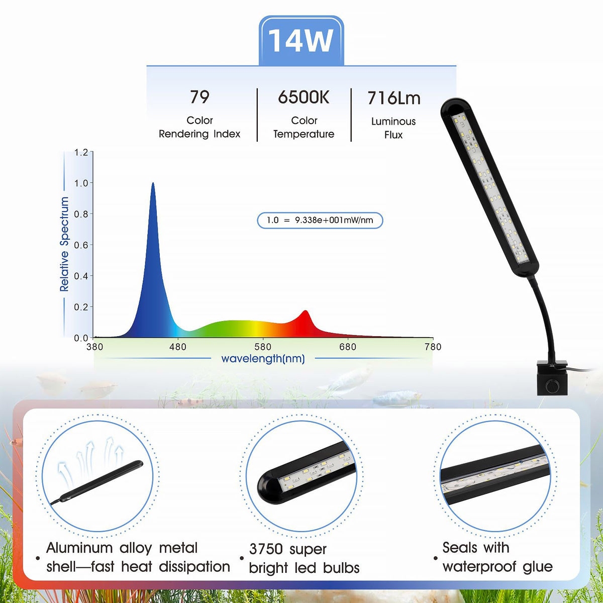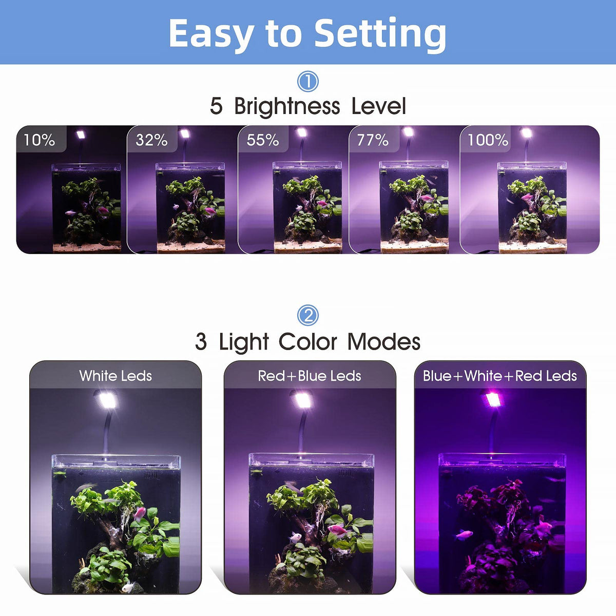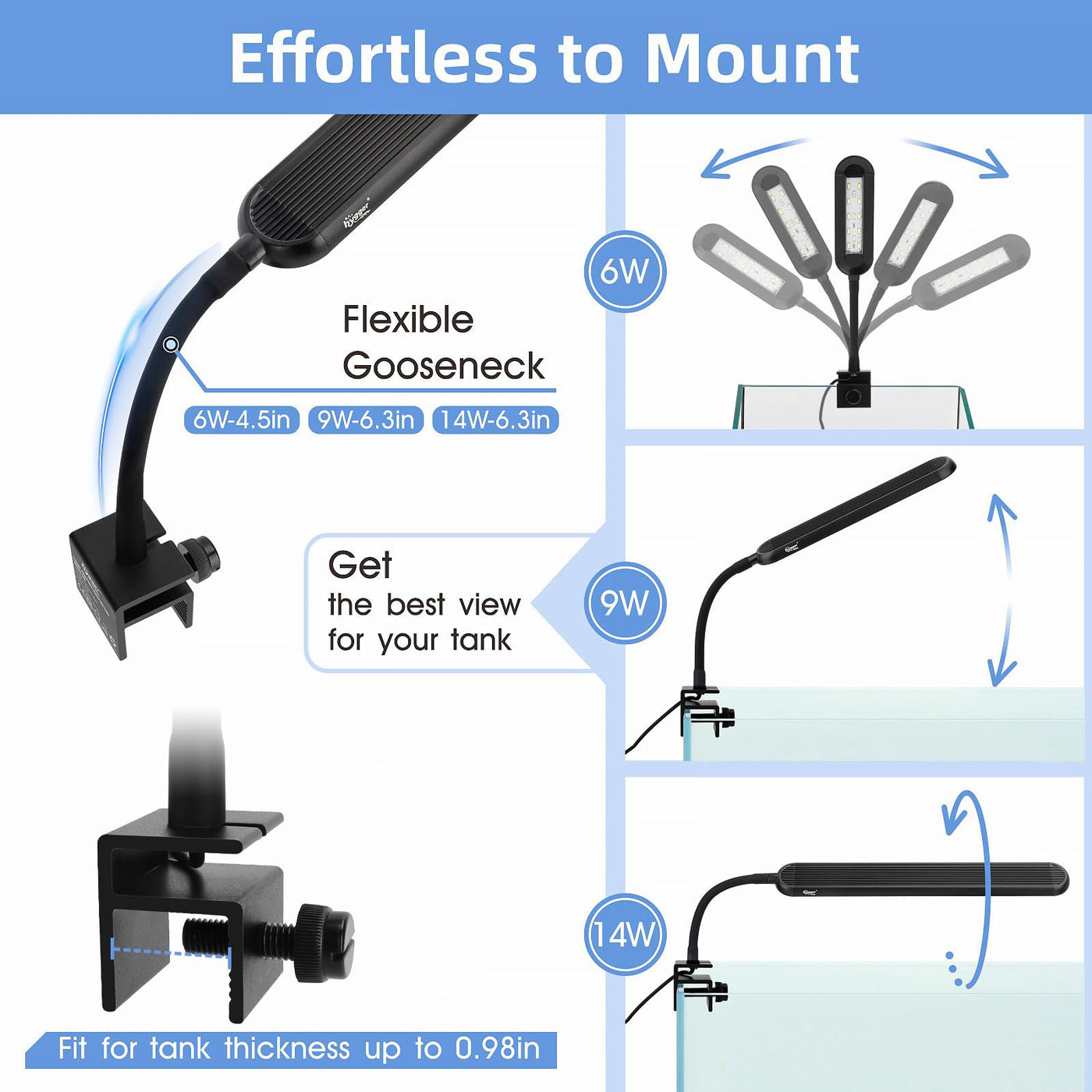 hygger 8-19 Gallon Clip-on Aquarium Light with White Blue Red LEDs Fish Tank Lighting Built-in Timer 5 Brightness Levels 14W