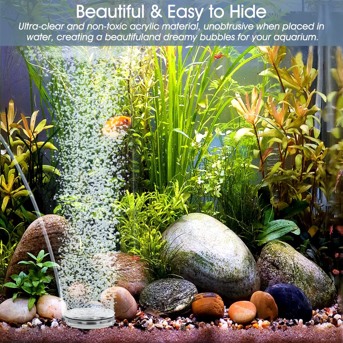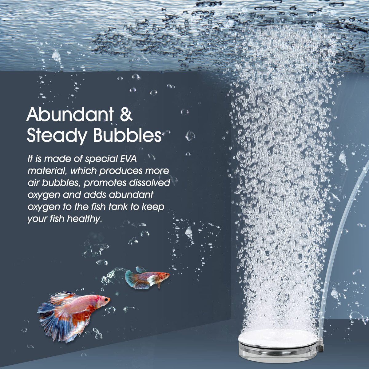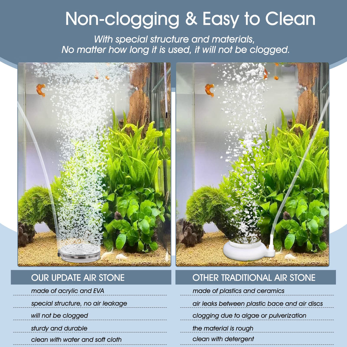 ever get cloggedUnlike traditional nono ceramic air stones this new air stone uses a special EVA material to produce air bubbles which makes it more resistant to corrosion No matter how long it is used it will not be clogged Durable and long-lasting Transparent & Easily HiddenThis air stones are made of high quality super transparent acrylic Each air stone measures 177 D x 06 H and weighs 2 ounces It is easily hidden under the water and wont move when working It creates beautiful and fantastic bubbles for your aquarium Ultra-high Dissolved OxygenOur aquarium bubbler has two aeration rings that quietly produce an abundance of dense medium bubbles great to add oxygen to your aquarium increase oxygen levels lower cO2 and raise PH Easy to UseThis air stones do not need to be soaked in water before use Simply put the air stone into water and then connect the air stone to a air pump it will create air bubbles immediately This air stones can be easily cleaned without any disinfectants or brushes Just take it apar wipe it gently with a soft cloth and rinse it under the faucet This is safer for your fish Warm TipIncludes a 177-inch(45mm) air stone 1 air tube 2m 1 suction cup 1 stainless steel pliers It is driven by 2W or larger wattage air pump Ideal for freshwater seawaterreef aquariums fish tanks hydroponics and small ponds NOTE: Please use the included plier to screw the bubble stone to the tightest before use
