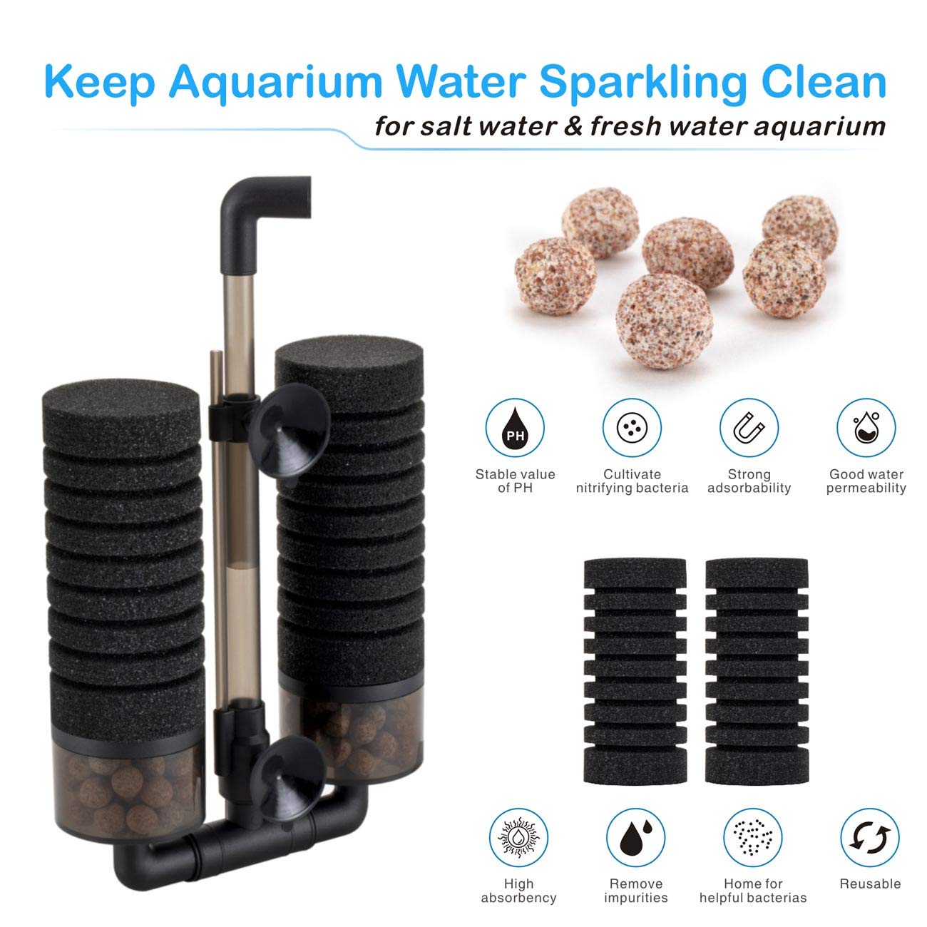 ulti-filtration functionsthis sponge aquarium filter combines bio-filtration oxygenation and physical filtration in 1 and also makes small water flow which can ensure the excellence of the water quality Helps your small fish or shrimp to live a happy healthy life ilter Demensionplus the sponge filter with media balls takes up no more room Small filter is 6 in width and 9 to 13 in height the sponge inside circle diameter is 039 inch suggest for 10 to 40 gallon fish tank Medium filter is 63 in width and 9 to 13 in height the sponge inside circle diameter is 059 inch suggest for 15 to 55 gallon fish tank For larger tank you may need 2 of this filter ackage Includes1 double sponge filter with 2 containers +1 bag of ceramic media balls + 2 pare sponges(packed in the 2 containers) This aquarium filter must be used with an air pupm and a standard size 4mm air hose please note pump and air hose are not included Please choose a powerful enough air pump according to your fish tank size for this filter etachable Fine Sponges you can easy to take down the 2 sponges from the filter to clean or replace it the 2 sponges are fine 60ppi not coarse which means more surface area for beneficial little creatures to live on Dont use tap water to clean it just rinse or squeeze the sponges by using the aquarium water Easy to useall the parts of this filter are detachable you can easily to assemble them together with 2 strong suction cups you can stick the filter firmly to any tank position under water withouting floating The water oulet tube can be extended and rotated you can adjust the outlet to above or below the waterline