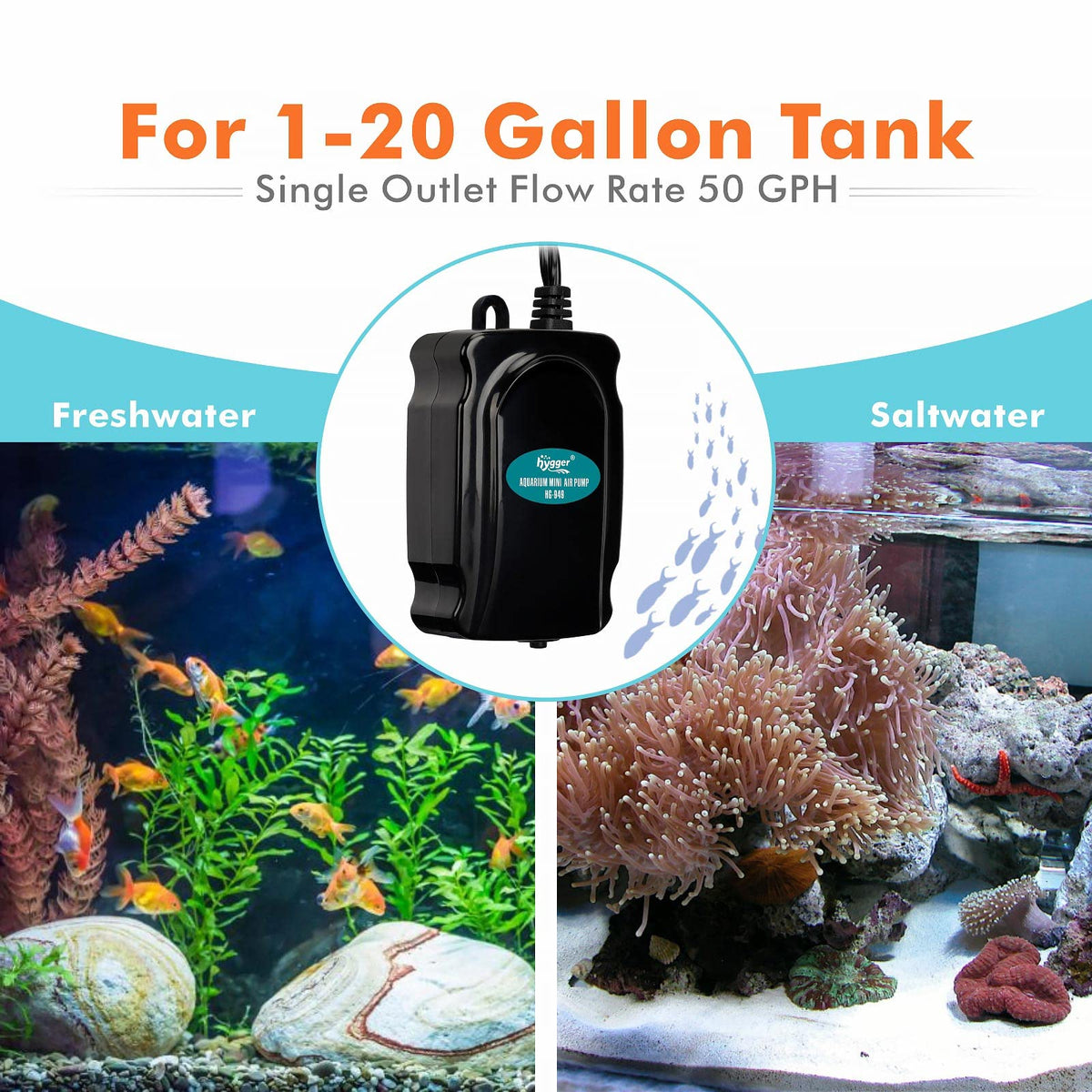 Q: What size aquarium is the hygger Mini Aquarium Air Pump suitable for?A: The hygger Mini Aquarium Air Pump is designed for aquariums ranging from 1 to 20 gallons, making it ideal for small fish tanks and fish bowls.