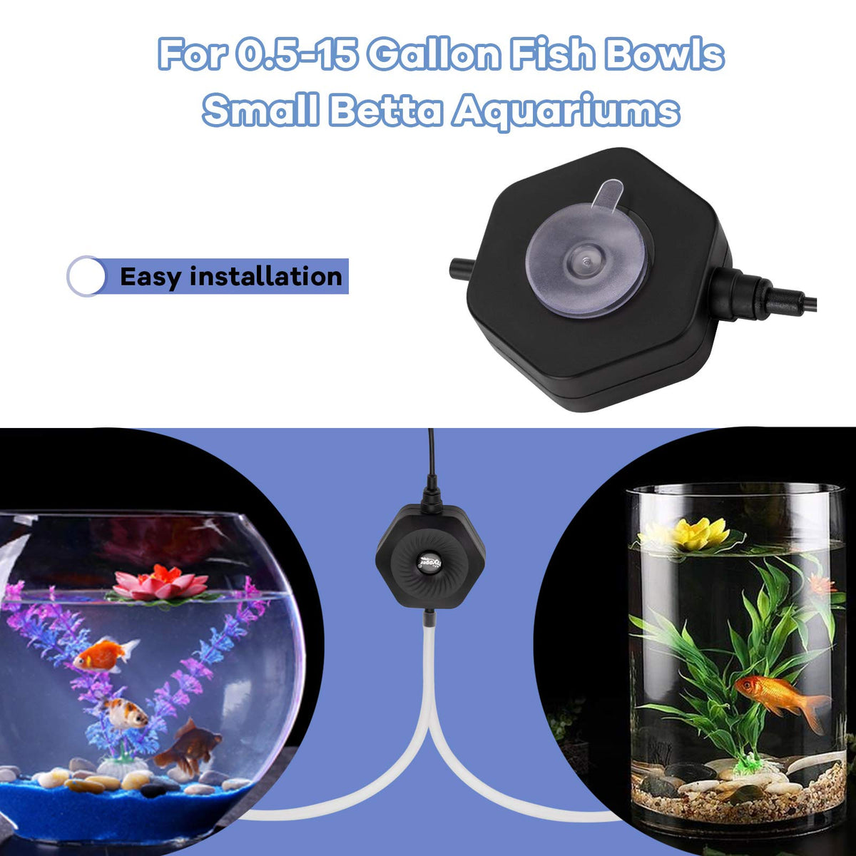 Q: What size aquarium is the hygger Quiet Mini Air Pump suitable for?A: The hygger Quiet Mini Air Pump is designed for aquariums and fish bowls ranging from 0.5 to 15 gallons, making it ideal for small tanks.
