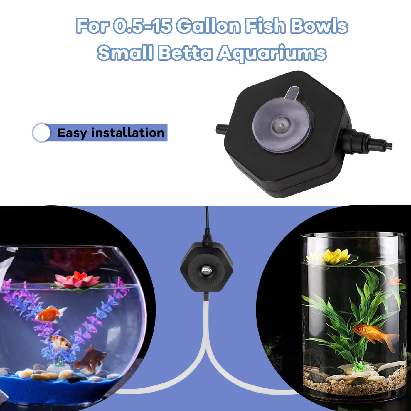Hygger Quiet Mini Small Aquarium Air Pump Betta Fish Tank Bubbler Oxygen Aeration Pump With Air Stone Tubing Suction Cup For 0.5-15 Gal Fish Bowl