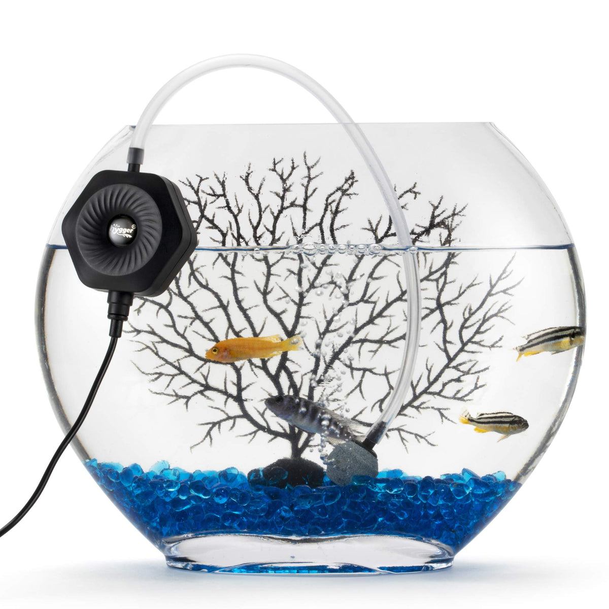 Q: What accessories are included with the hygger air pump?A: The air pump comes ready-to-go with essential accessories including a dual suction cup, 3.6 ft air tubing, and a mini air stone, allowing for quick and easy setup.