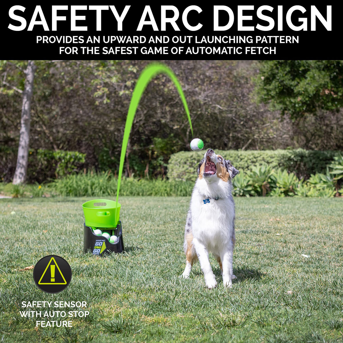 Experience the ultimate interactive playtime with your furry friend using the Hyper Pet GoDogGo Fetch Machine Dog Ball Launcher. This innovative toy offers two exciting ways to play fetch. Set the time and launch distance settings to let the machine automatically launch balls on its own, or take control with the remote from up to 50 feet away. The wide-mouth bucket with handles makes ball return easy for your pet, ensuring uninterrupted fun.Measuring just 14' x 13' x 17' and weighing 8 pounds, this compact and versatile fetch machine is perfect for outdoor use. It comes complete with 5 GoDogGo dog tennis balls, a remote control, rechargeable lithium batteries, and an AC adapter. The GoDogGo Fetch Machine is designed with safety in mind, featuring a safety arc and sensor that provide an upward and outward launch pattern. However, it's important to train your pet to stand off to the side or 3 feet in front of the launcher.Customize the play experience with configurable settings. Choose from three time setting options (4, 7, and 15-second launch intervals) and adjust the distance settings for launch ranges of 12 to 35 feet. Please note that distances may vary depending on the dog tennis ball size, type, and condition. The GoDogGo Fetch Machine runs on AC power or rechargeable batteries, offering flexibility. Remember to remove all balls, turn on the machine, and plug it in to charge. Charging is indicated by a steady green light.Bring excitement, exercise, and safety to playtime with the Hyper Pet GoDogGo Fetch Machine Dog Ball Launcher. Watch as your dog delights in chasing and retrieving balls, staying active and entertained for hours on end. Get ready for an upgraded game of fetch like never before!