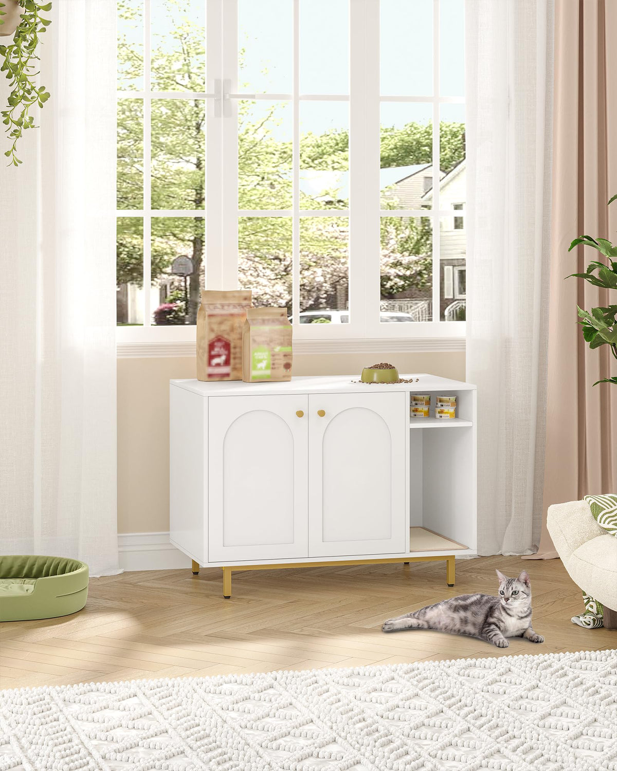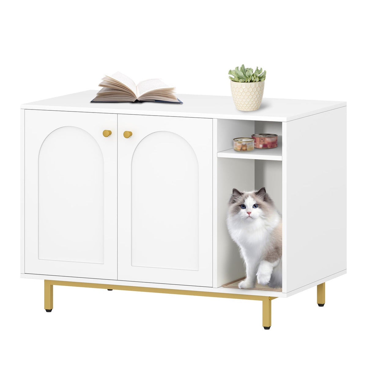Specifications: Color: White And Gold Material: Particle Board,Steel Product Size: 39.4 X 21.7X 28.3 Inches (100 X 55 X 72 Cm) Product Weight: 48.4 Lbs (22 Kg) Max.Static Load Capacity Of The Top : 132 Ib (60 Kg) Package Contents: 1 X Litter Box Enclosure 1 X Accessory Kit 1 X Instruction Manual Hzuaneri Notes: Do Not Step On Or Sit On The Product.