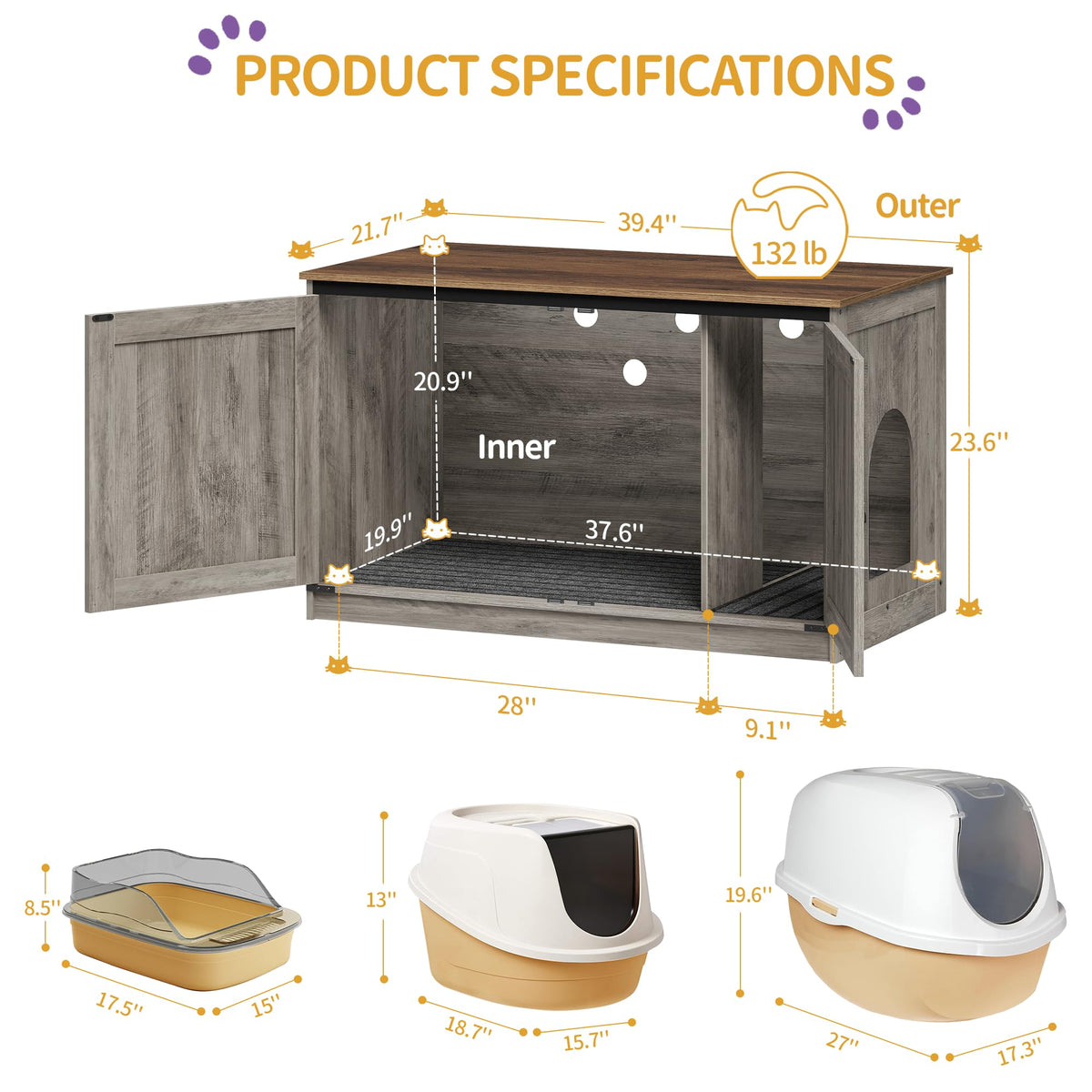 SPECIFICATIONS: ? Color: Greige ? Material: Particle Board ? Product Size: 39.4 x 21.7 x 23.6 inches (100 x 55 x 60 cm) ? Product Weight: 41.6 lbs (18.9 kg) ? Max.Static Load Capacity of the Top (with the Inner Divider): 100 Ib (45 kg) ? Max. Static Load Capacity of the Top (without the Inner Divider): 30 Ib (13.6 kg) PACKAGE CONTENTS: ? 1 x Litter Box Enclosure ? 1 x Accessory Kit ? 1 x Instruction Manual HZUANERI NOTES: ? Do not step on or sit on the product.