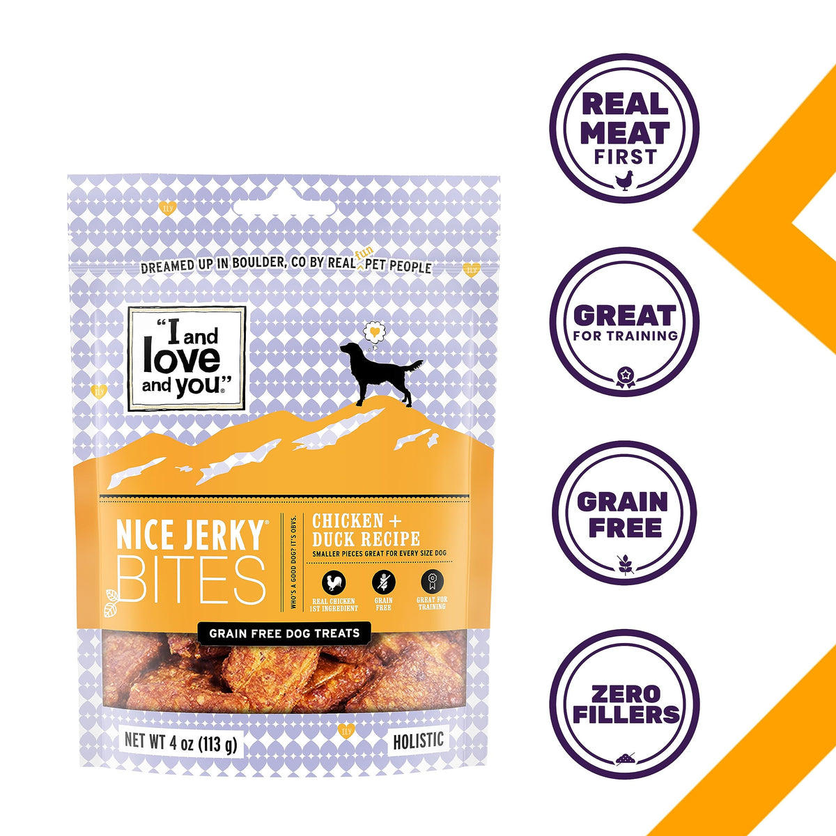 I and love and you Nice Jerky Bites - Chicken + Duck - Grain Free, Real Beef, Training Treat, Chewy Dog Treats, Filler Free, 4oz