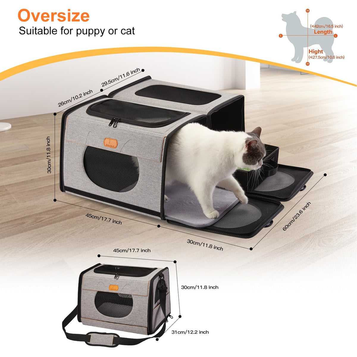 Pet Travel Carrier: Travel Litter Box For Cats. The Newest Design Is The Perfect Combination Of Travel Cat Carrier And Litter Box To Solve The Problem Of Cats Going To The Cat Litter While Traveling. Collapsible Pet Carrier: The Bag Is Foldable And Folds Into A Separate Cat Cage When The Cat Litter Box Is No Needed. Easy To Store And Does Not Take Up Space. Safe & Comfortable: Lightweight And Robust. The Four-Side Net Is Breathable, The Zipper Locks Make Pets Safer. Large Space: Size 24'X17.7'X11.8'. Separate Litter Space For Pets. Outdoor Cat Carrier: In Addition To The Cat Carrier And Litter Box, There Is Also An Extra Travel Pack Includes A 1* Litter Shovel; 2* Collapsible Bowl; 1* Hard Case.