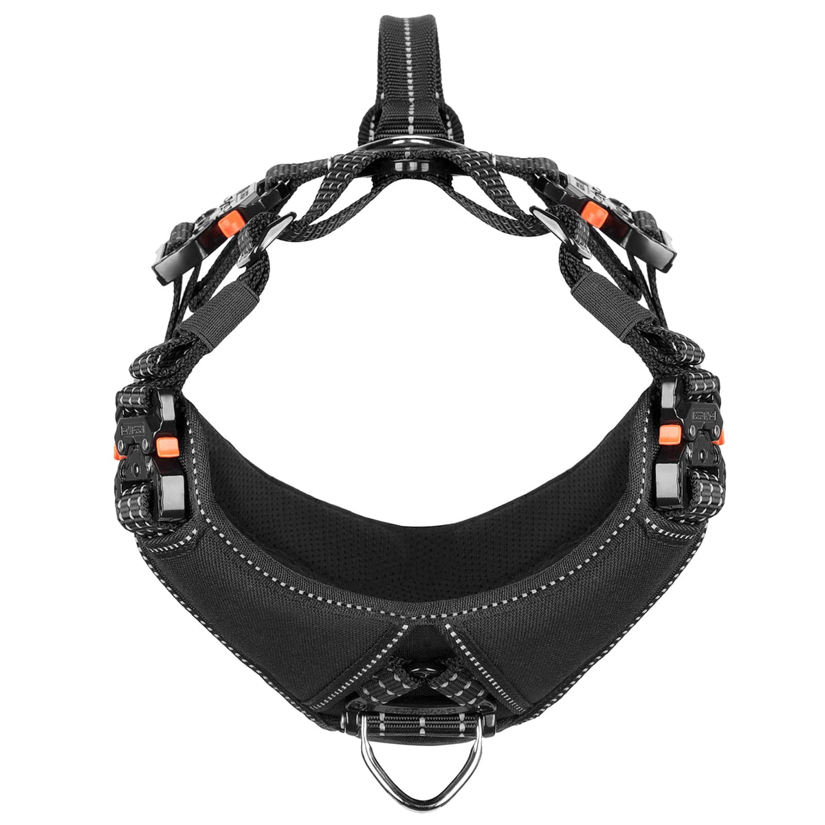 Q: Does the harness prevent pulling during walks?A: Yes, the harness features a no-pull front leash clip that helps to distribute pulling force evenly across the harness rather than the dog's throat. This design minimizes pressure and encourages better walking behavior.