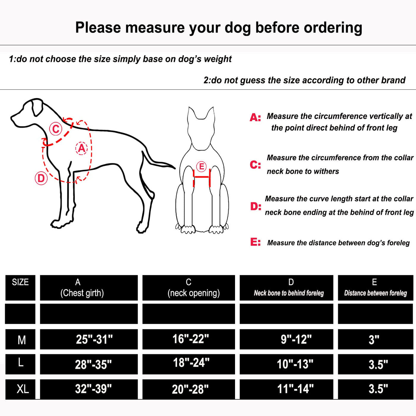 Tips:1:This is not to be used with a tie out; 2:Please refer to our size chart,Make sure match up your dog's lower neck ( C: right above their shoulders) and chest measurements( A:the widest part of the chest); Do not choose the size base on dog's weight or guess
