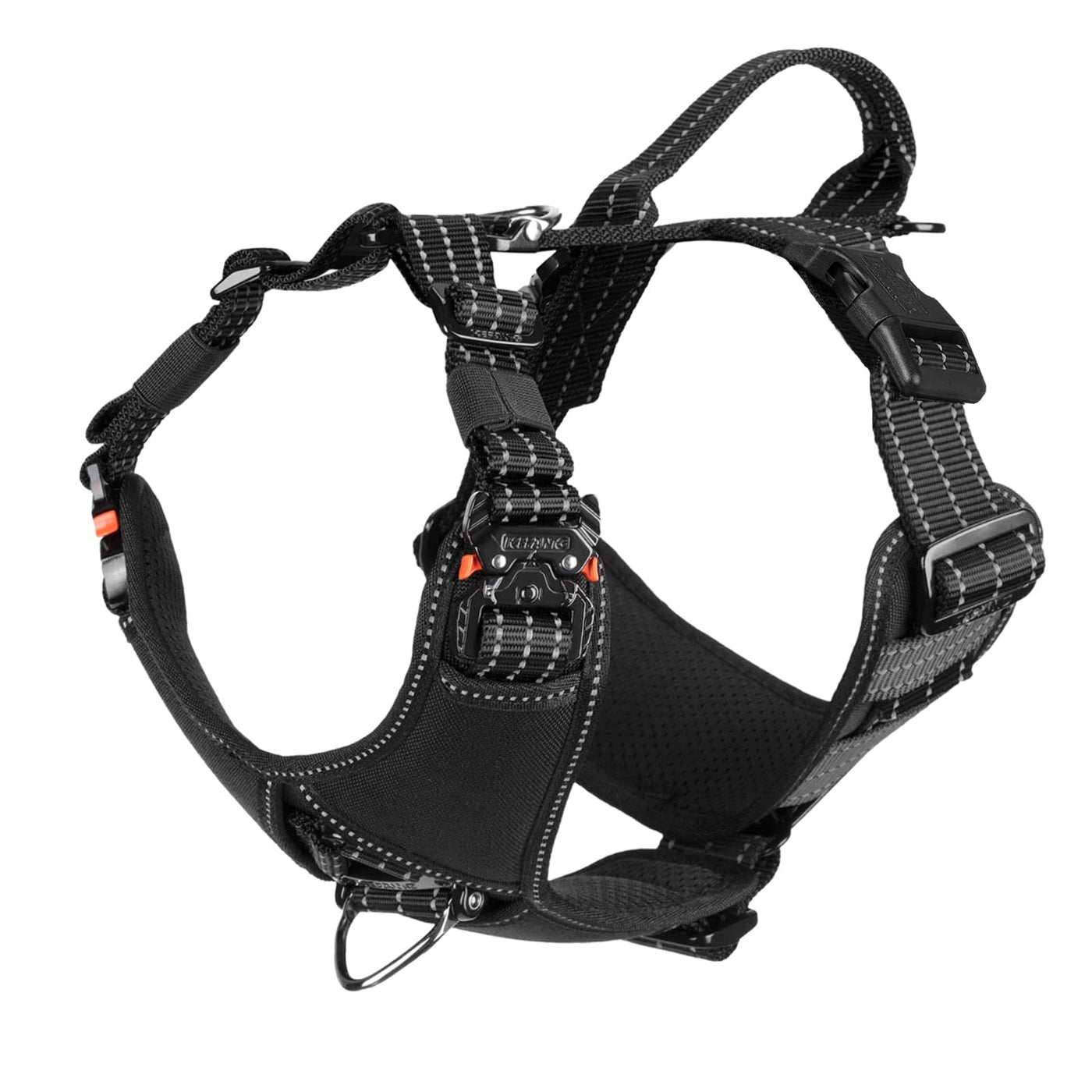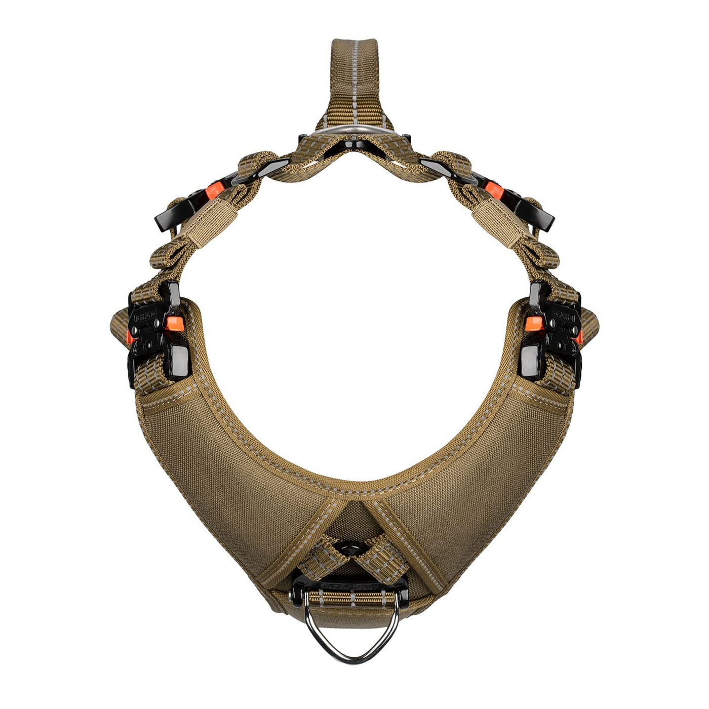 Climbing rated triangle hardware and Integrated metal rotation V-ring on front and back ,Directly connect both triangle hardware with our thicker nylon strap ,make sure the pull force is evenly distributed on metal hardware instead of fabric and stitch