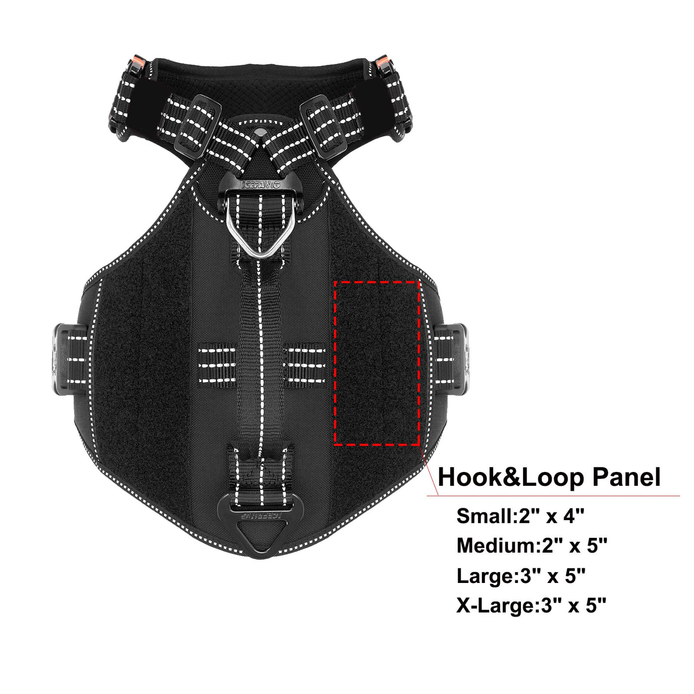 Q: Can I attach patches to this harness?A: Yes, the ICEFANG GN8 Tactical Dog Harness comes with a Hook and Loop Panel on both sides, allowing you to attach patches for identification or customization. The medium panel measures 2" x 5" and the large/x-large panel measures 3" x 5".