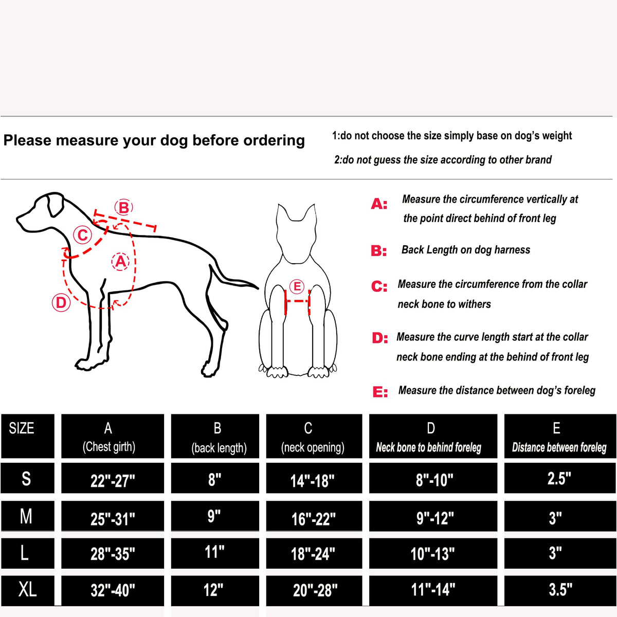 Tips:1:This is not to be used with a tie out; 2:Please refer to our size chart,Make sure match up your dog's lower neck ( C: right above their shoulders) and chest measurements( A:the widest part of the chest); Do not choose the size base on dog's weight or guess