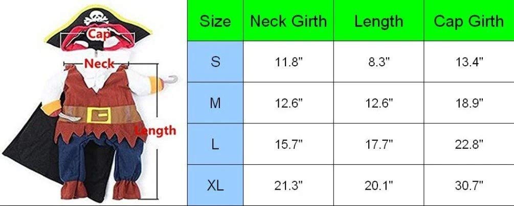 Q: What sizes are available for the Idepet Pirate Dog Cat Costume?A: The Idepet Pirate Dog Cat Costume is available in four sizes: Small (S), Medium (M), Large (L), and Extra Large (XL). Please refer to the size chart for detailed measurements to ensure the perfect fit for your pet.