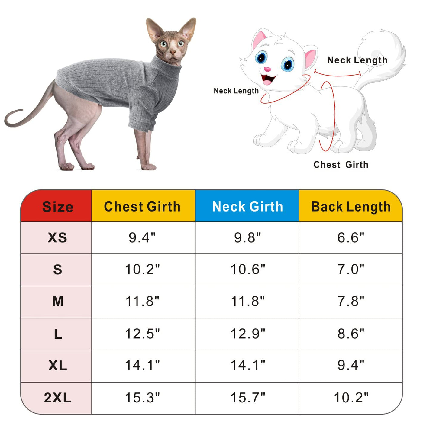 Size Suggestions: 1.If any of the measurements are 'between' two sizes, choose the larger size. 2.If your cat is growing up, you can order a bigger size. 3.Take each measurement a bit loosely, so there will be room for your cat to move and breathe, but not too loose.