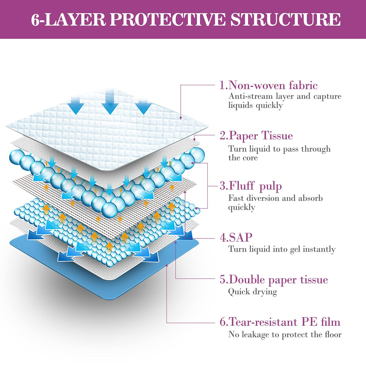 Q: How do these dog training pads prevent leaks?A: These dog training pads feature a 6-layer protection design, including a waterproof polyethylene backing that blocks leaks for up to 24 hours, ensuring your floors or carpets remain clean.