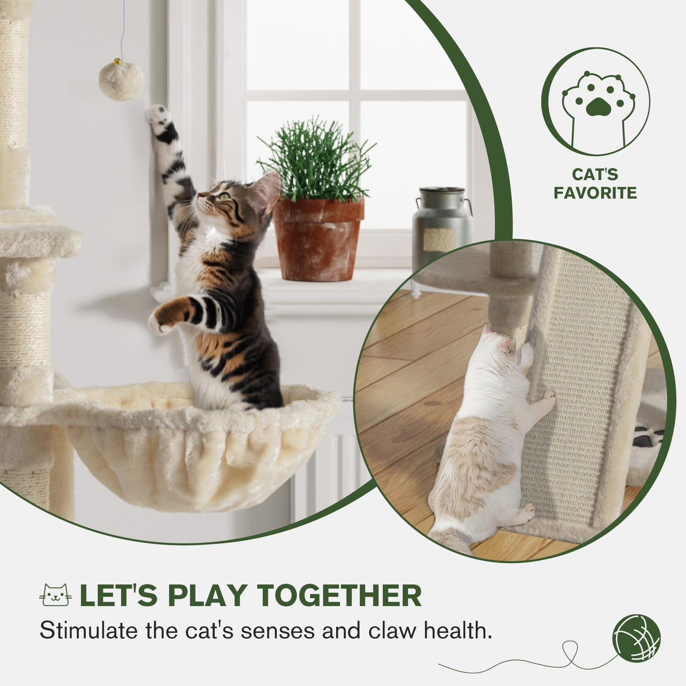 SAFE & STABLE This exclusive luxury cat tree tower is crafted out of a cARB-certified P2-grade particle board featuring high-density construction and superior durability ensuring the overall stability of the cat tree The posts are coiled with natural sisal A strip is provided to attach the cat tree to the wall for the prevention of tipping over ULTI-LAYERED PLAYHOUSE This multiple-level cat tree is designed for more than one cat to play at the same time A spacious cat tree expands the usable area vertically and offers more space for pets to climb and explore cOMFY HOME FOR ENTERTAININg Two fluffy condos offer warm spots three furry balls can respond to kittensA move intensively and draw their attention sisal rope coiled posts and scratching ladder help encourage positive scratching behavior a multi-layer tower meets the climbing nature of kittens three padded plush perches provides a cozy place to rest STURDY & DURABLEeatures a 24x20 big baseboard to avoid wobbling or tipping over and ensures its stability a built-in solid structure that can easily hold up to 33 lb soft plush and durable sisal rope coiled posts are strong and sturdy enough to survive from those sharp little claws EASY ASSEMBLY Easy to assemble with step-by-step instruction and tools included