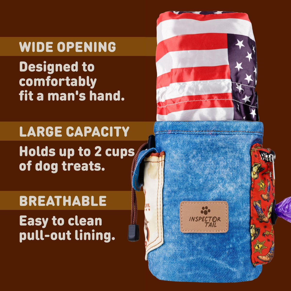 Upgrade your dog training and your puppy training tools with our cute dog treat pouch. So, enhance every training session with our treat holder for dog training designed for dog parents and trainers who demand both convenience and style. This multi-functional dog training pouch is your solution for carrying treats, toys and personal essentials. Whether youre training your pup, hiking trails or walking through neighbourhood, this dog training fanny pack, has you covered. With a spacious 2 cup main compartment, this dog treat bags training pouch can hold plenty of kibble, treats or even a small toy. This dog training treat bag provides quick access to treats, keeping them fresh and secure with its airtight drawstring closure. Our fanny pack for dog training is lightweight yet spacious. This dog treat carrier has two side pockets: one for small items and another with a built-in poop bag dispenser for hassle-free cleanups. Designed for ultimate convenience, our stylish dog treat pouch has 4 options to wear with the adjustable waistband and the sturdy belt clip. Whether clipped to your belt, worn around your waits, or styled crossbody this dog treat bags training pouch keeps everything within reach. Our dog treat bag inspector tail is perfect for dog trainers who need quick access to rewards during lessons, dog parents who want a convenient way to carry treats and outdoor enthusiasts who enjoy hiking, walking, or exploring with their furry friends. With trendy design and practical features, this dog treat bag is ready to become an essential part of your dogs routine. Easy to clean, our doggie treat bags are the perfect blend of function and fashion for dog trainers and pet owners. Upgrade your dog training tools with this must have dog puch. Whether youre using it for puppy training or for advanced training, this dog snack pouch is the perfect dog behaviour aid to reinforce positive habits.