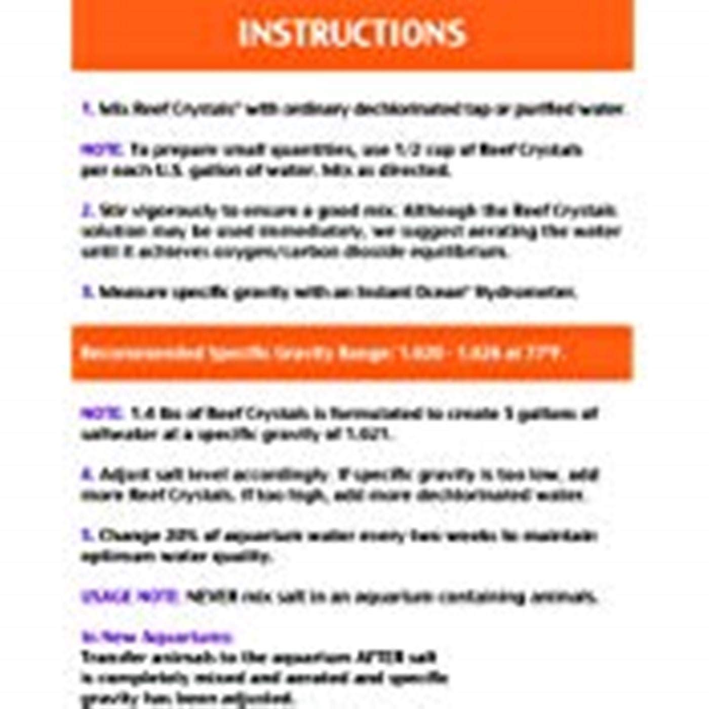No matter the size of your aquarium, Instant Ocean sea salts and water care products offer the smartest, easiest way to bring the ocean home. Our scientifically formulated sea salts are used exclusively by many of the leading large-scale aquariums and research facilities across the country. Instant Ocean Reef Crystals Reef Salt is formulated especially for use in reef aquariums. It contains essential ocean reef elements in concentrations greater than those found in natural sea water. Extra calcium encourages the growth of large and small polyp stony corals (LPS and SPS) as well as coralline algae. Extra trace elements provide an additional measure of vital nutrients, and extra vitamins help to promote vigorous growth and survival of corals, anemones and other invertebrates in a captive environment. Neutralizes traces of heavy metals often present in tap water. Mix Instant Ocean Reef Crystals Reef Salt with ordinary dechlorinated tap water - use cup per gallon of water. Stir vigorously to ensure a good mix. Use immediately or aerate the water until it achieves oxygen/carbon dioxide equilibrium. See product label for complete use directions. Instant Ocean offers a full line of products, including sea salt, water treatments, test kits and accessories, to make sure your saltwater aquarium remains vibrant and healthy.