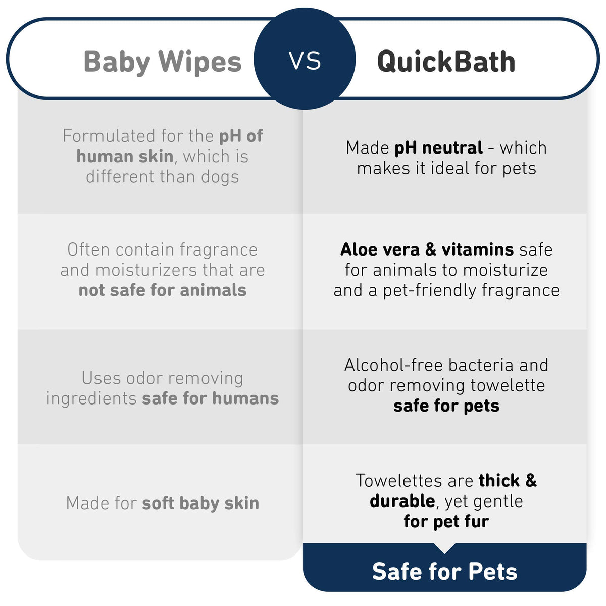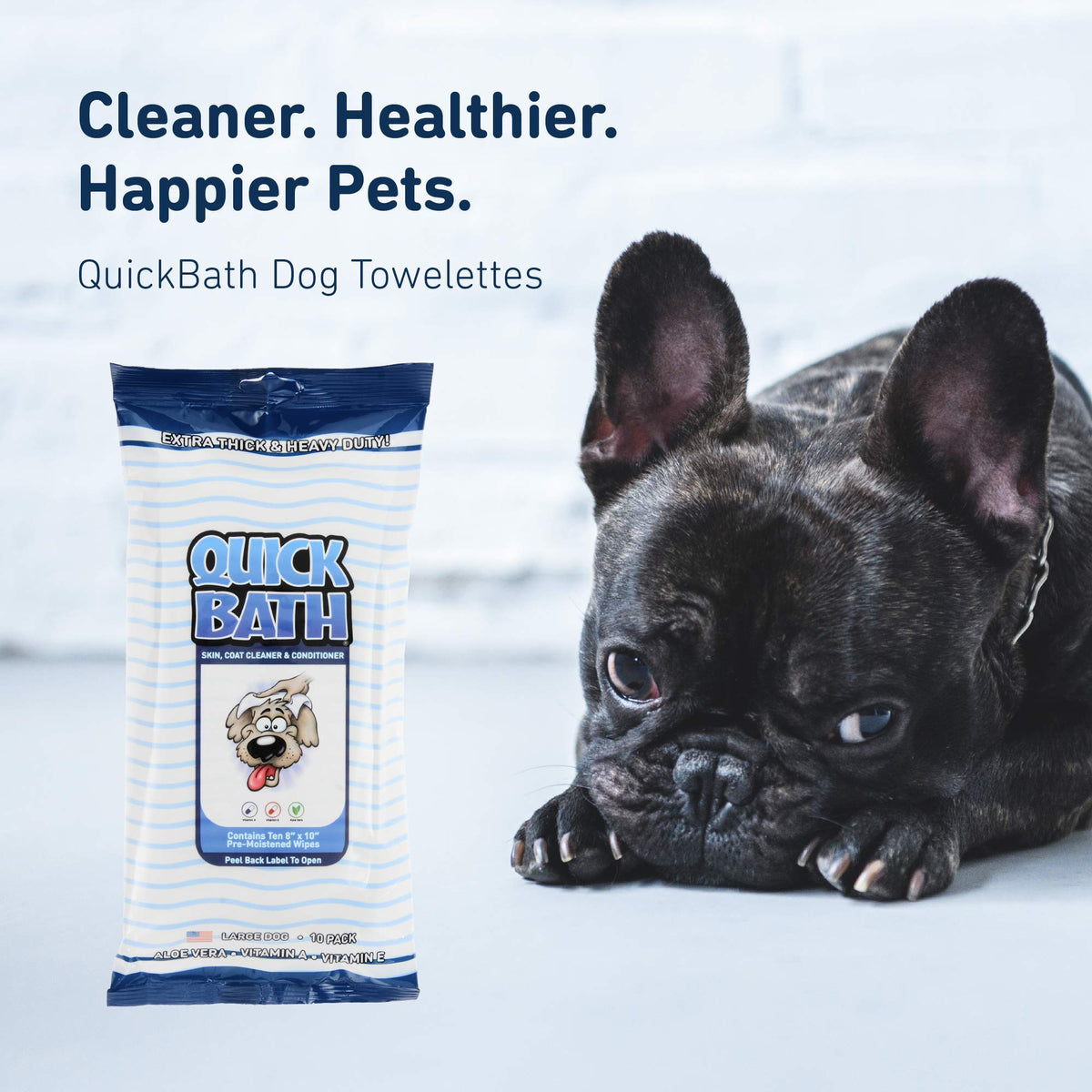 Q: How should I use the Quick Bath wipes on my dog?A: To use the Quick Bath wipes, simply take a towelette and gently wipe your dog's skin and fur, focusing on areas that may need extra attention such as the ears, face, paws, and tail. There’s no need to rinse afterward.