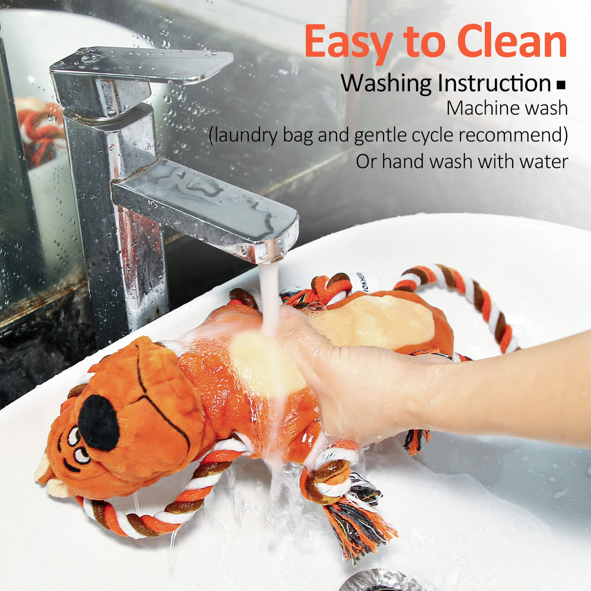 Q: How do I clean the IOKHEIRA plush dog toy?A: The IOKHEIRA plush dog toy has a waterproof layer inside to prevent saliva from entering the filling. It can be washed with water, making it easy to keep clean and hygienic for your furry friend.