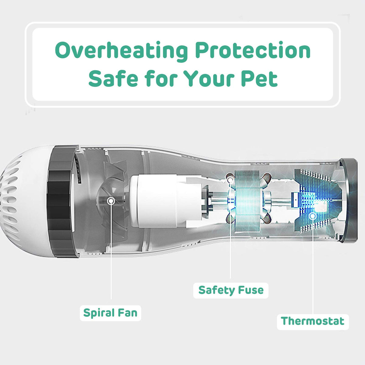 Q: What safety features does the iPettie Pet Hair Dryer have?A: The iPettie Pet Hair Dryer includes several safety features, such as an automatic shut-off function when overheating is detected. Additionally, its double wall design prevents the outer surface from becoming too hot, ensuring safe use during grooming.