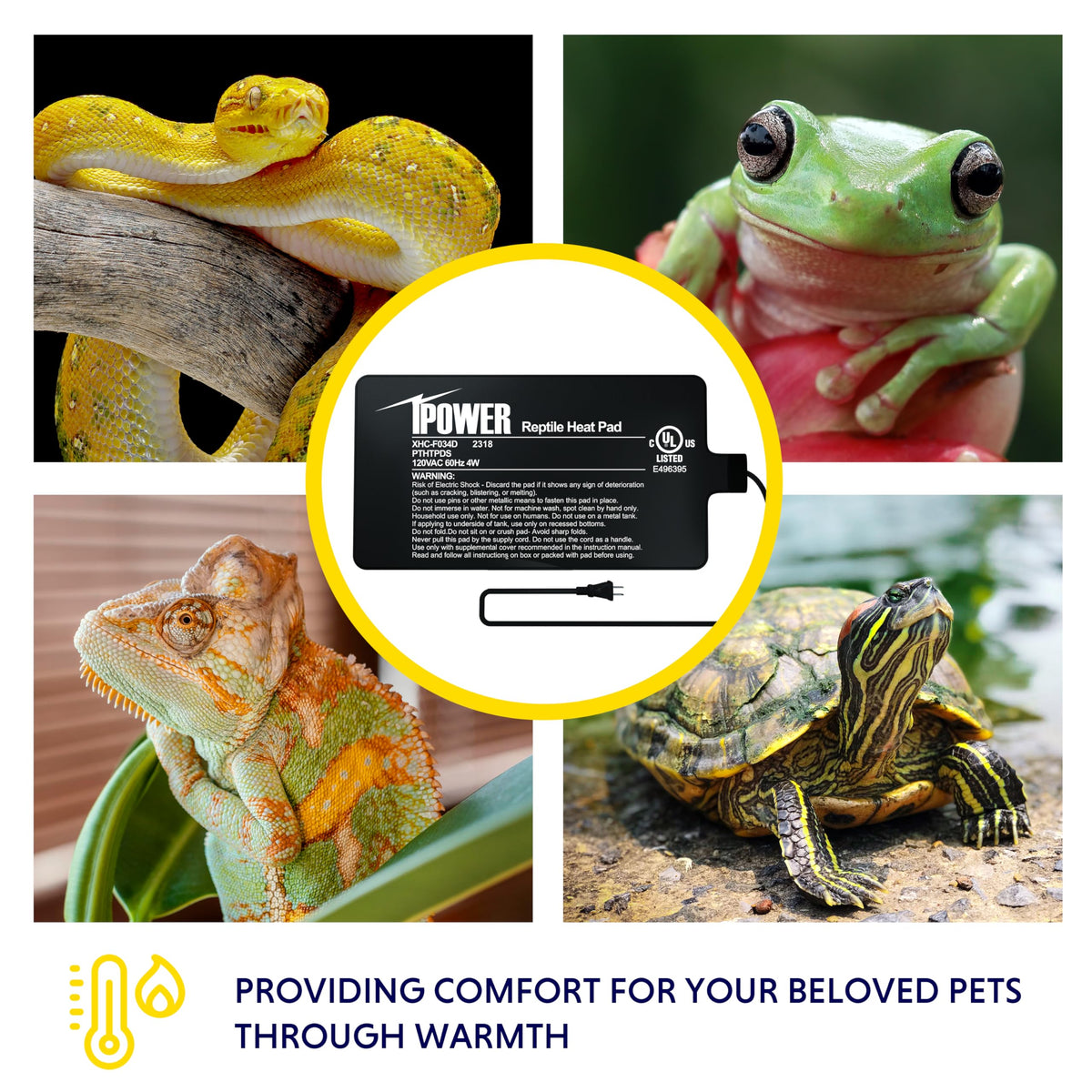 WARNING: Risk of Fire. Never mount the iPower Reptile Heat Pad in a manner that would encapsulate heat. (i.e. mounting it on the bottom of a terrarium and then setting the terrarium directly on any type of table or the floor/carpet). Always use the enclosed rubber feet to elevate your terrarium thus allowing the heat to escape. If unsure of bottom mounting, the side mounting of the iPower Reptile Heat Pad is the preferred application.