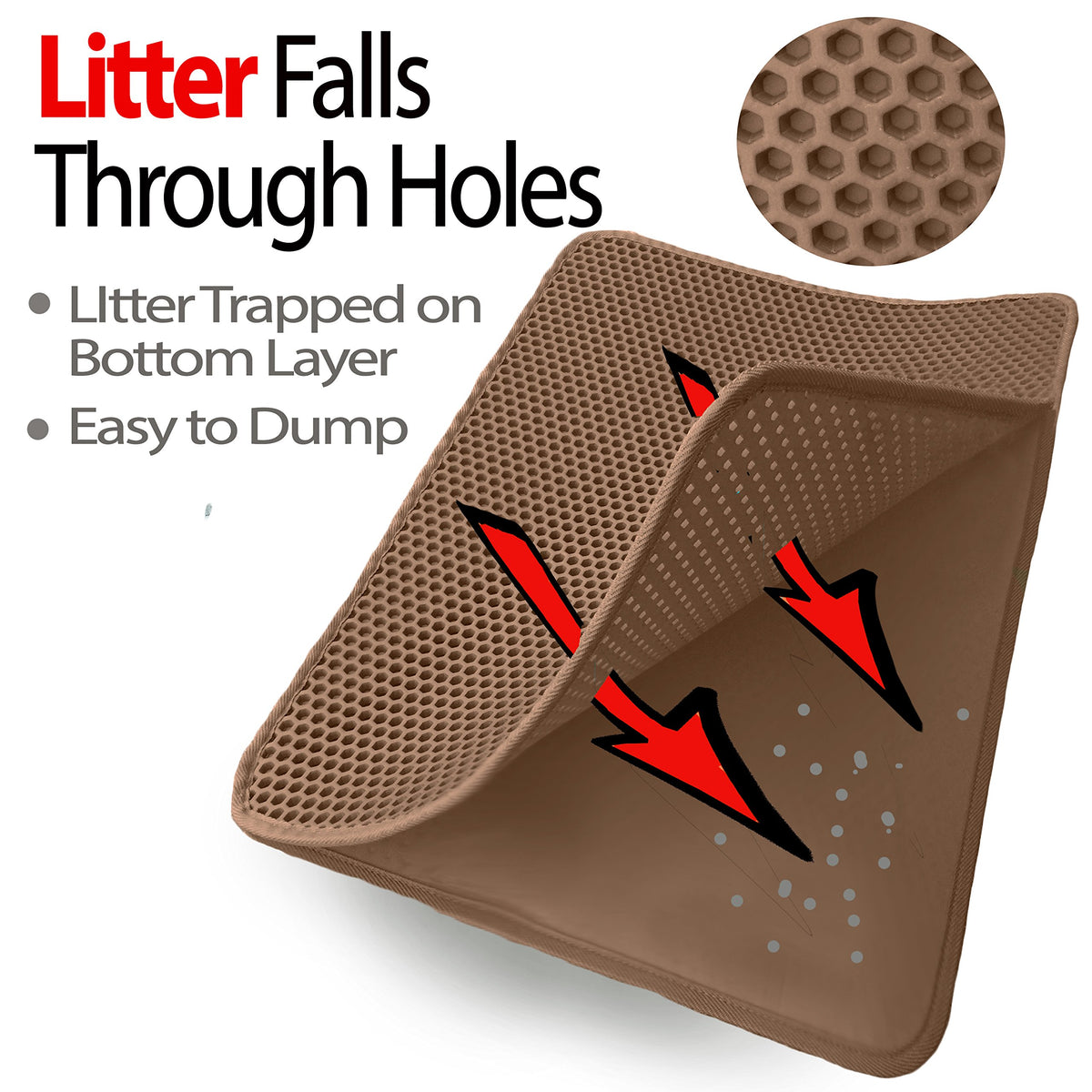 ADVANCED LITTER TRAPPING TECHNOLOGY: Our iPrimio Large Cat Litter Trapper Mat sets the gold standard with extra-large holes that outperform the competition. It effectively captures litter from your cats paws and litter box, ensuring a cleaner space. | EXCLUSIVE URINE/WATERPROOF LAYER: Say goodbye to false claims! Our Trapper Mat features an exclusive plastic film with a patent-pending design, expertly repelling urine. Trust in its reliability-unlike other mats that merely claim urine resistance. | MESS-FREE SOLUTION FOR MESSY CATS: Designed for really messy cats, our mat is super light, featuring a stylish brown color. For added protection, use puppy pads for excessive urine, especially around the nylon mesh border. Keep your surroundings clean and odor-free. | PAW-FRIENDLY AND SPACIOUS: Pamper your cats paws with the super smooth surface of our mat. The XL size (30 inches long, 23 inches wide) provides ample space for your feline friend to move comfortably. Experience the ultimate in cat litter mat comfort and efficiency. | EASY CLEANING WITH EZ OPEN EDGE: Simplify your cleanup routine with the EZ Open Edge, allowing for hassle-free cleaning under the sink or shower head. Simply shake off any trapped litter. Sized at 30 inches by 23 inches, its the perfect fit for your cats hygiene needs. Check out our JUMBO and SMALL versions for even more options!