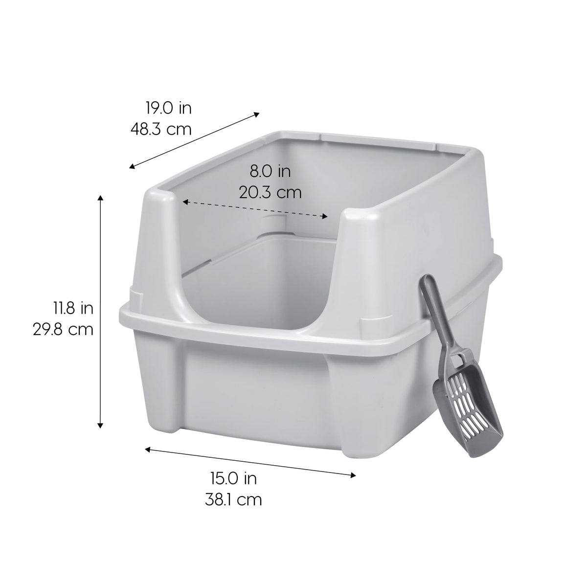 Iris Usa Large Cat Litter Box With Scatter Shield And Scoop, Open Top High Sided Cat Litter Pan, Silver